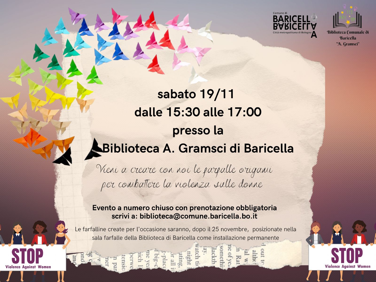 Il laboratorio è rivolto ai bambini dai 5 anni che creeranno, con i loro accompagnatori, delle farfalline con carta origami che saranno parte integrante dell'opera che l'amministrazione inaugurerà il 25 novembre in occasione della giornata mondiale contro la violenza sulle donne.