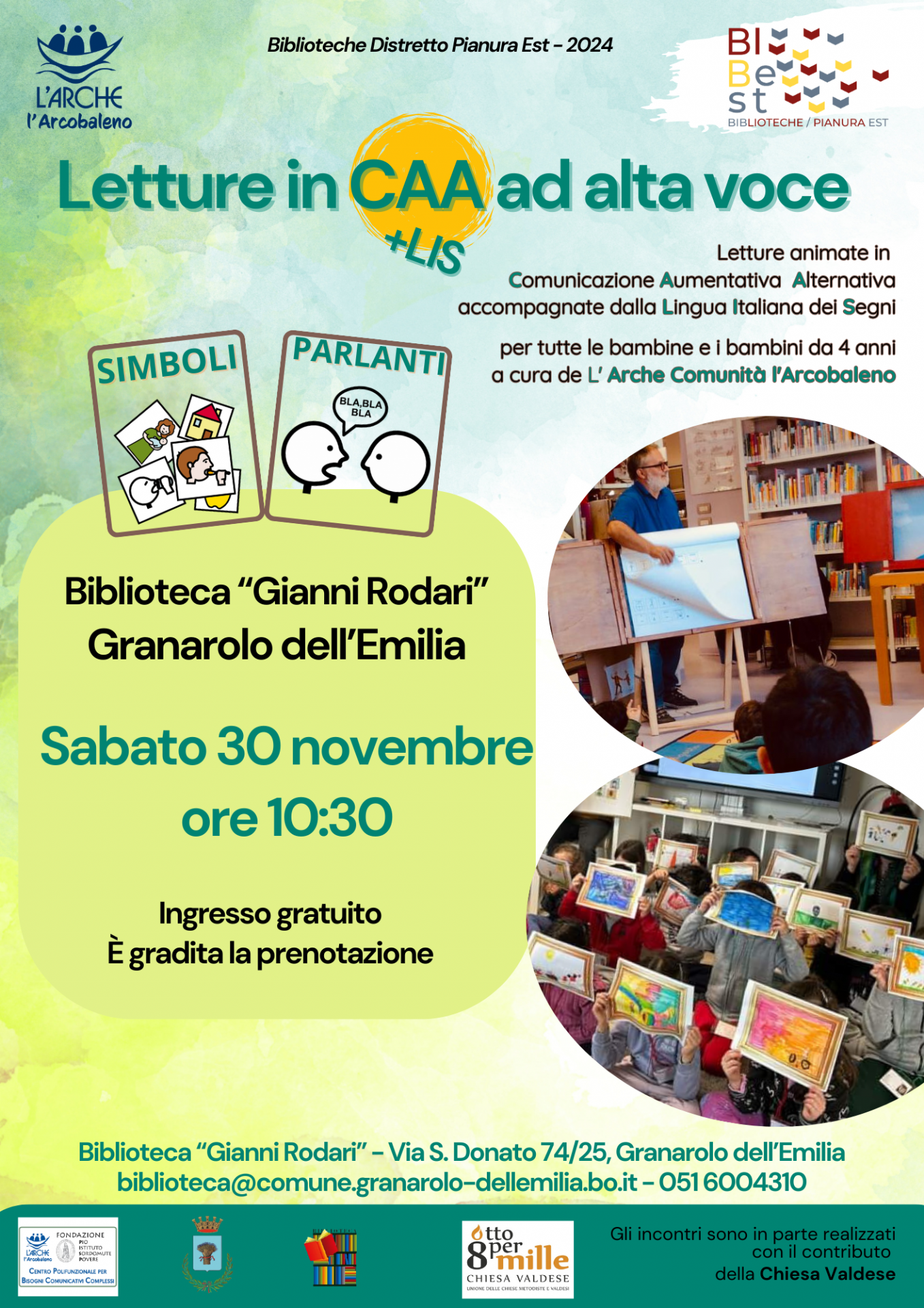Sabato 30 novembre alle ore 10:30, la Biblioteca "Gianni Rodari" di Granarolo dell'Emilia ospiterà un incontro di Letture in CAA (Comunicazione Aumentativa Alternativa) ad alta voce, arricchite dalla Lingua Italiana dei Segni (LIS). L'evento, dedicato a tutte le bambine e i bambini dai 4 anni in su, sarà animato e curato dalla Comunità L'Arche Arcobaleno.