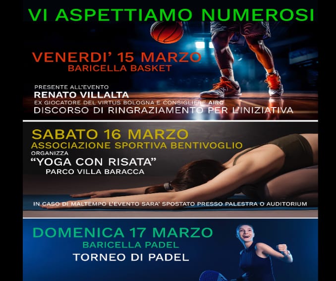 A partire da Venerdì 15 Marzo, con il patrocinio del comune di Baricella, si svolgeranno una serie di iniziative sportive il cui ricavato sarà devoluto alla Fondazione AIRC per la ricerca sul cancro.