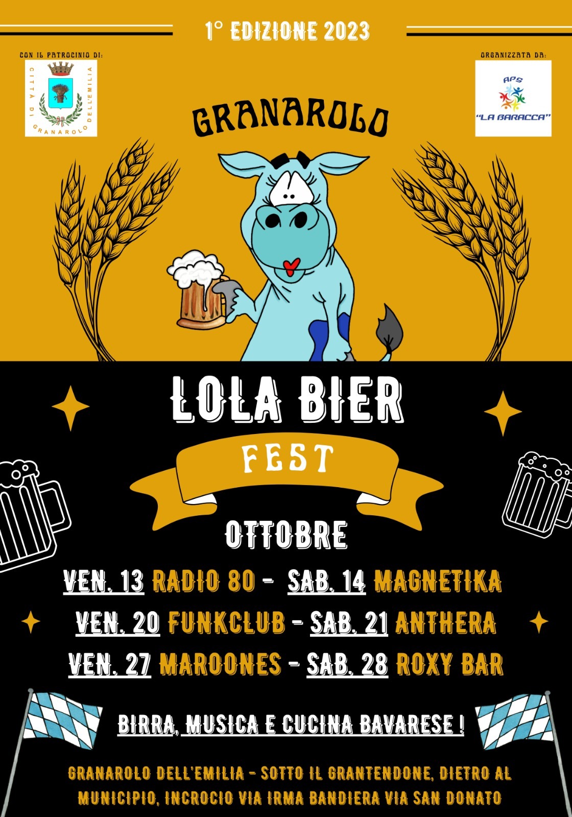 “Vogliamo dare a Granarolo la sua prima festa della birra, sul modello di quelle che hanno grande successo in tante altre realtà a noi vicine – spiega Alessandro Barbieri, coordinatore della Baracca -. Da un anno un gruppo di “ragazzi” sta lavorando a questa iniziativa, noi abbiamo subito appoggiato l’idea ed insieme anche ad altre associazioni granarolesi stiamo organizzando la prima edizione della “Lola Bier Fest”, intitolata alla mucca di fantasia che è ormai diventata un’icona del nostro paese”.