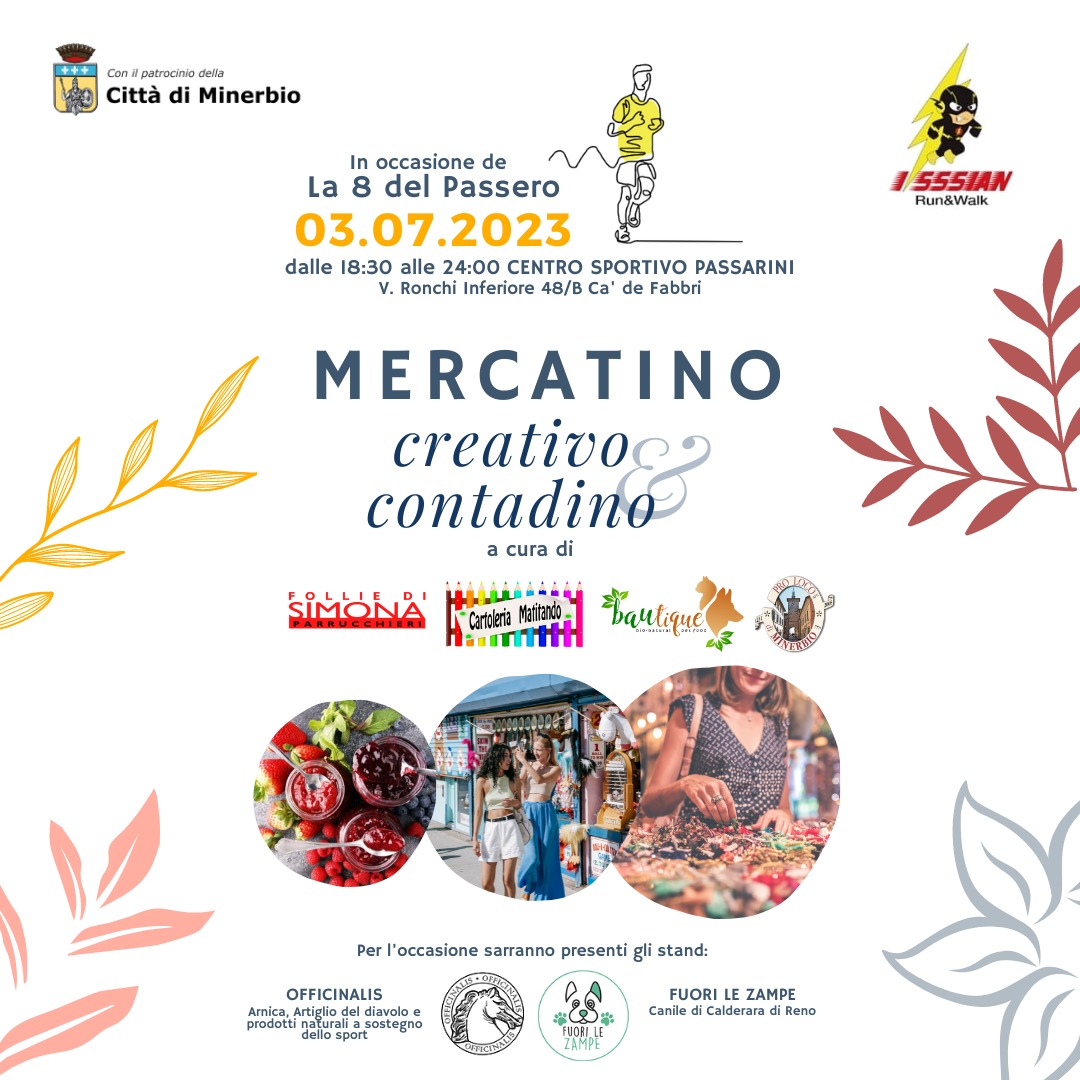 In occasione della Otto del Passero, lunedì 3 luglio 2023 dalle ore 18.30 a mezzanotte presso il Centro Sportivo Passarini a Ca' de' Fabbri ci sarà il Mercatino Creativo e Contadino a cura di Pro Loco di Minerbio, Follie di Simona, Cartoleria Matitando e Boutique, in collaborazione con I SSSIAN Run&Walk, col patrocinio del Comune di Minerbio. Saranno anche presenti Fuori le Zampe e Officinalis.