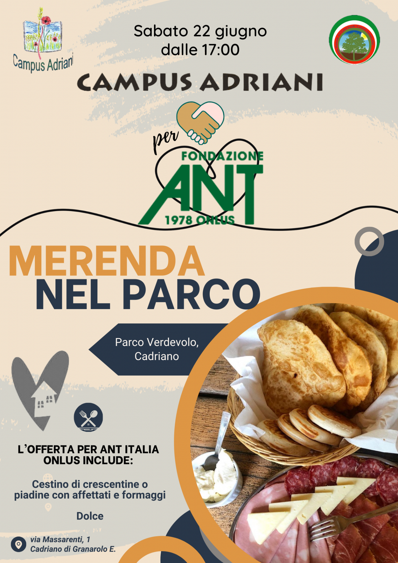 Sabato 22 giugno, a partire dalle 17.00, il Parco Verdevolo di Cadriano ospiterà una merenda speciale organizzata dal Campus Adriani per sostenere la Fondazione ANT Italia ONLUS.