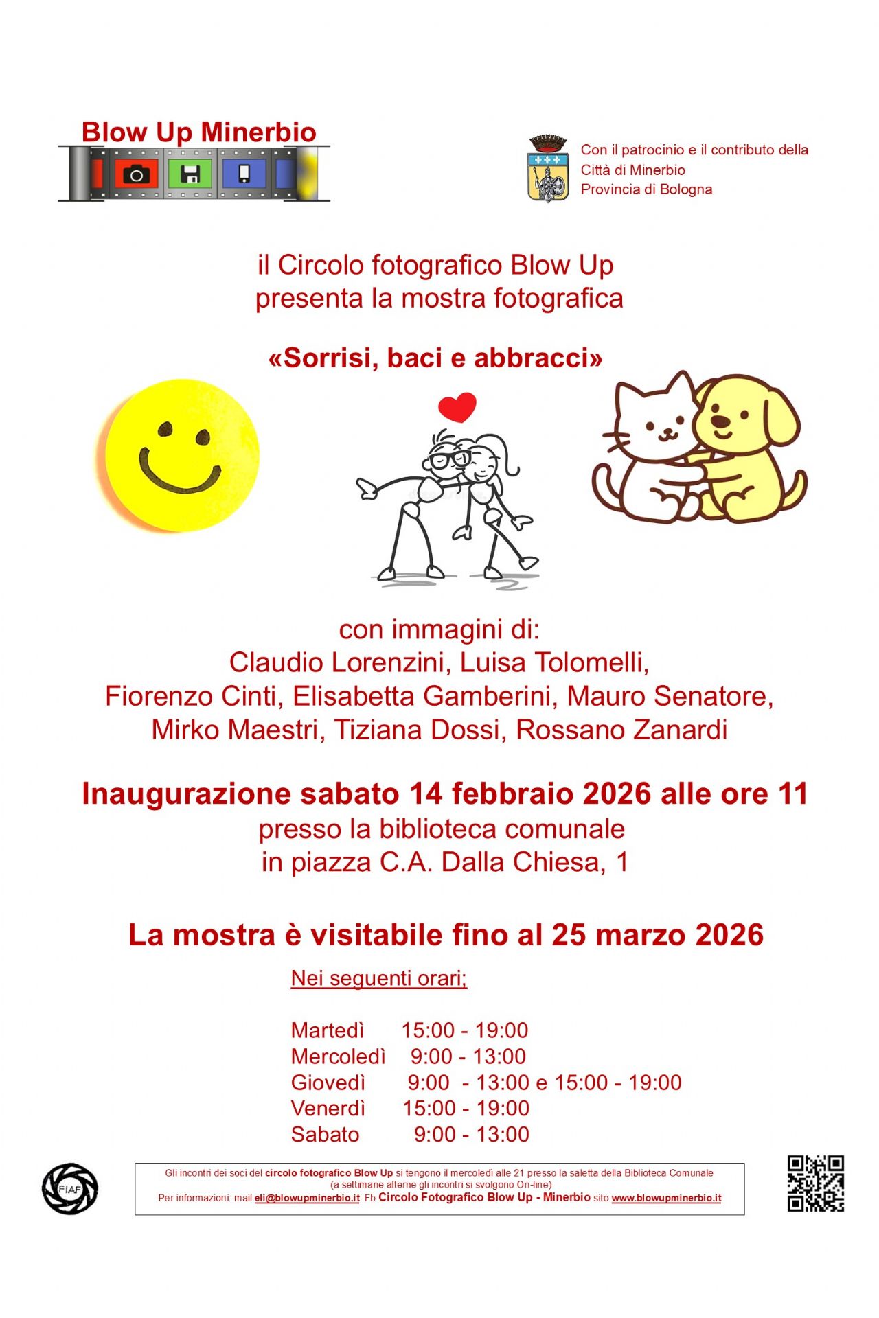 Sabato 14 febbraio 2026 alle ore 11.00 presso la Biblioteca Comunale Prometeo di Minerbio si terrà l'inaugurazione della mostra fotografica "Sorrisi, baci e abbracci" a cura del Circolo Fotografico Blow up.