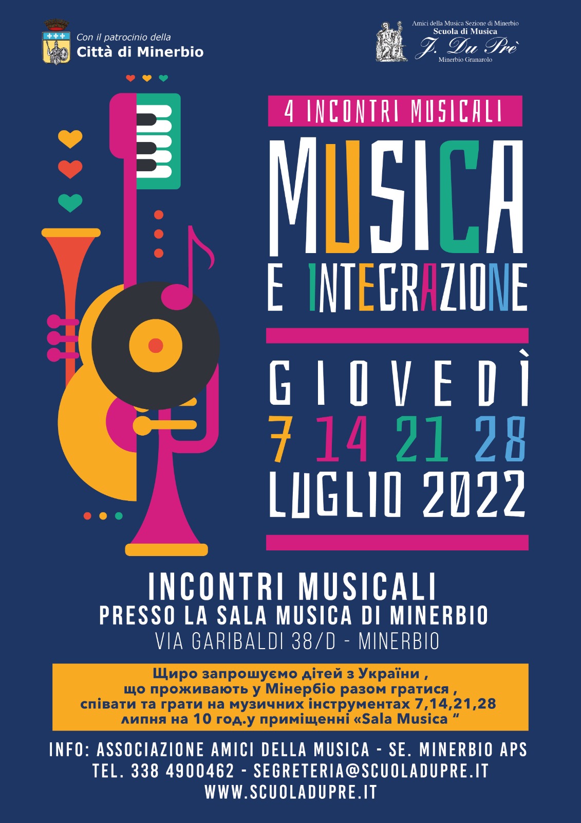 La Scuola di Musica J.Du Prè organizza 4 incontri musicali rivolti all'integrazione il 7, 14, 21 e 28 luglio.