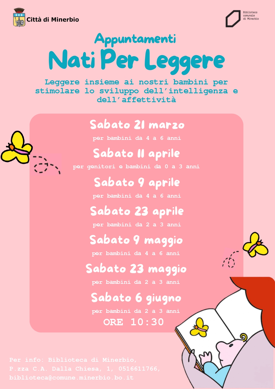Sabato 11 aprile 2026 alle ore 10.30 presso la Biblioteca Comunale Prometeo di Minerbio (Piazza C.A. Dalla Chiesa, 1 Minerbio) si terrà il secondo appuntamento primaverile di Nati per leggere, dedicato ai genitori e ai bambini da 0 a 3 anni.