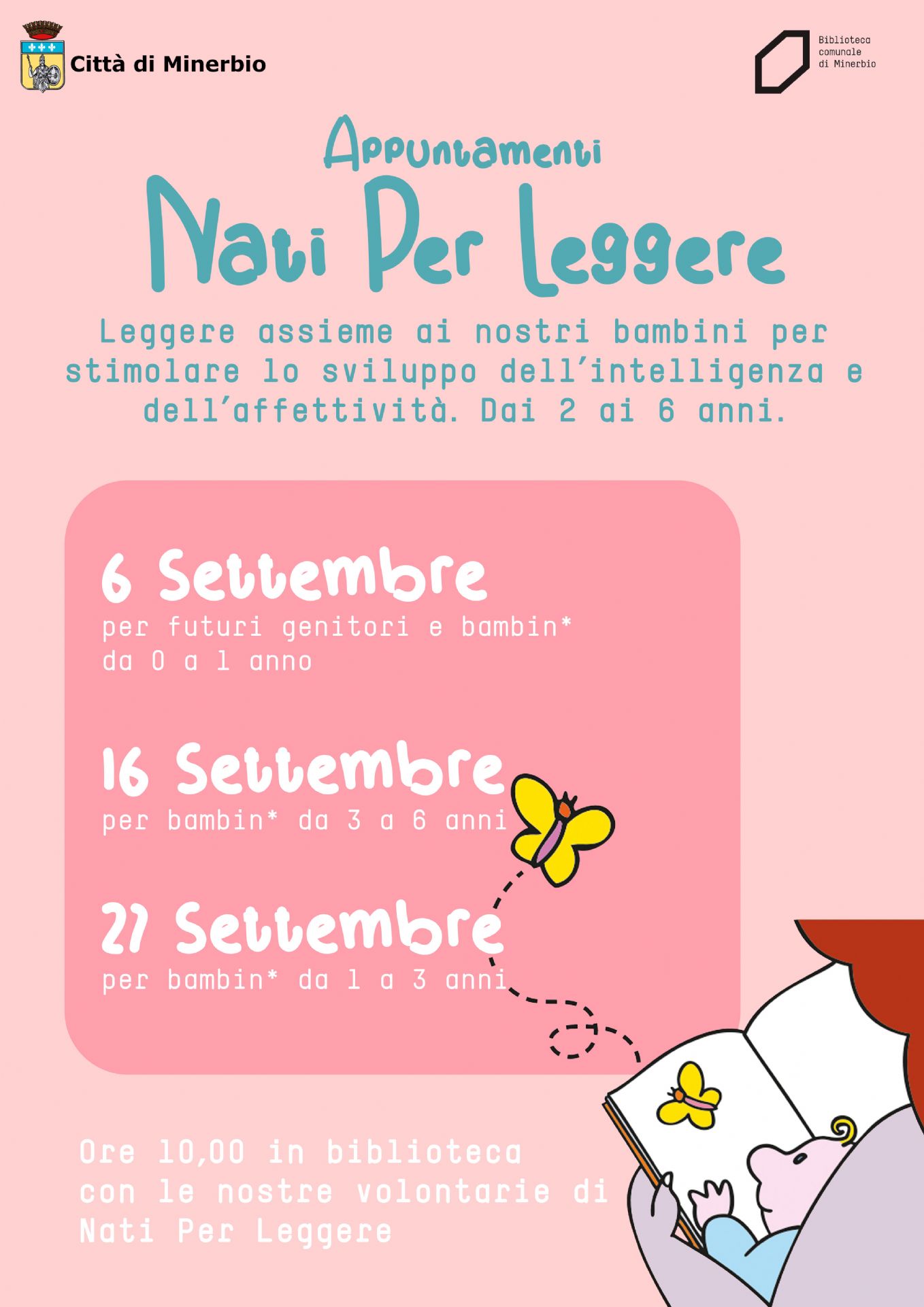 si terranno a settembre 2023 tre appuntamenti di Nati per leggere: leggere insieme ai nostri bambini per stimolare lo sviluppo dell'intelligenza e dell'affettività.