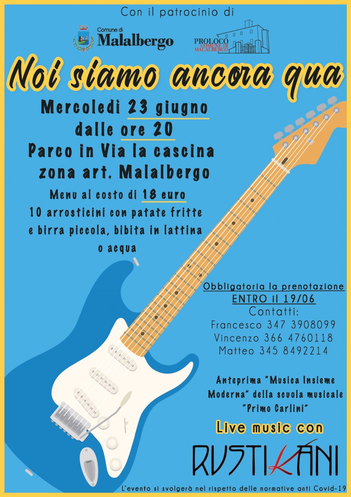 L'Associazione Proloco di Malalbergo, mercoledì 23 giugno dalle ore 20.00 al Parco in Via La Cascina, organizza la manifestazione "Noi siamo ancora qua", una serata di live music con i Rustikani, l'anteprima "Musica Insieme Moderna" della Scuola Musicale Primo Carlini e stand gastronomico per la degustazione di arrosticini.