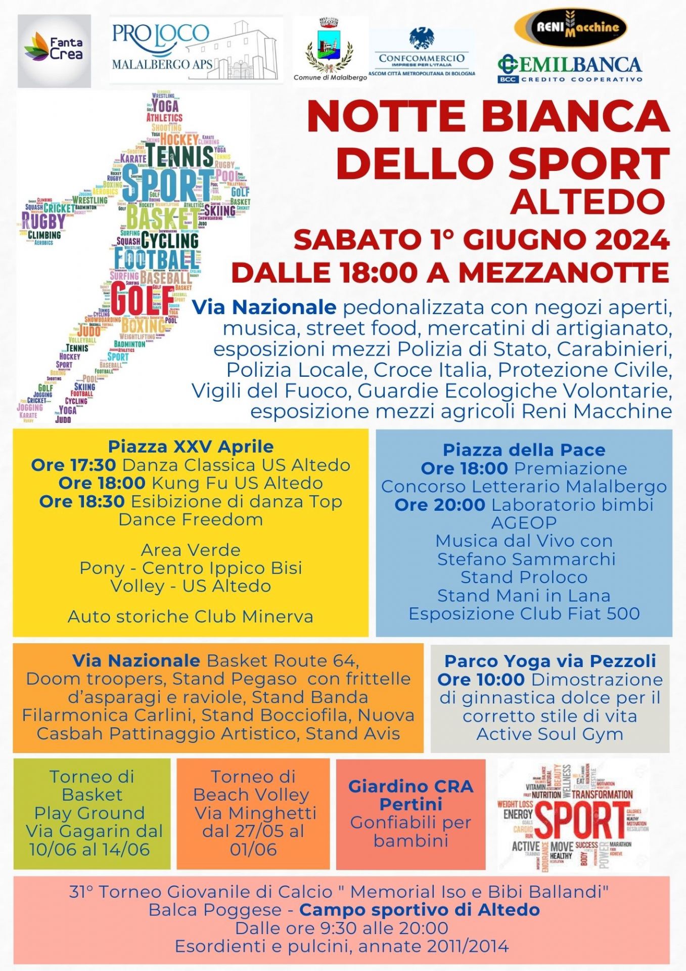 Torna la Festa dello Sport, giunta alla sua sesta edizione e organizzata dalle associazioni sportive del territorio e dalla Proloco di Malalbergo, con la collaborazione dei commercianti e la partecipazione delle associazioni locali.