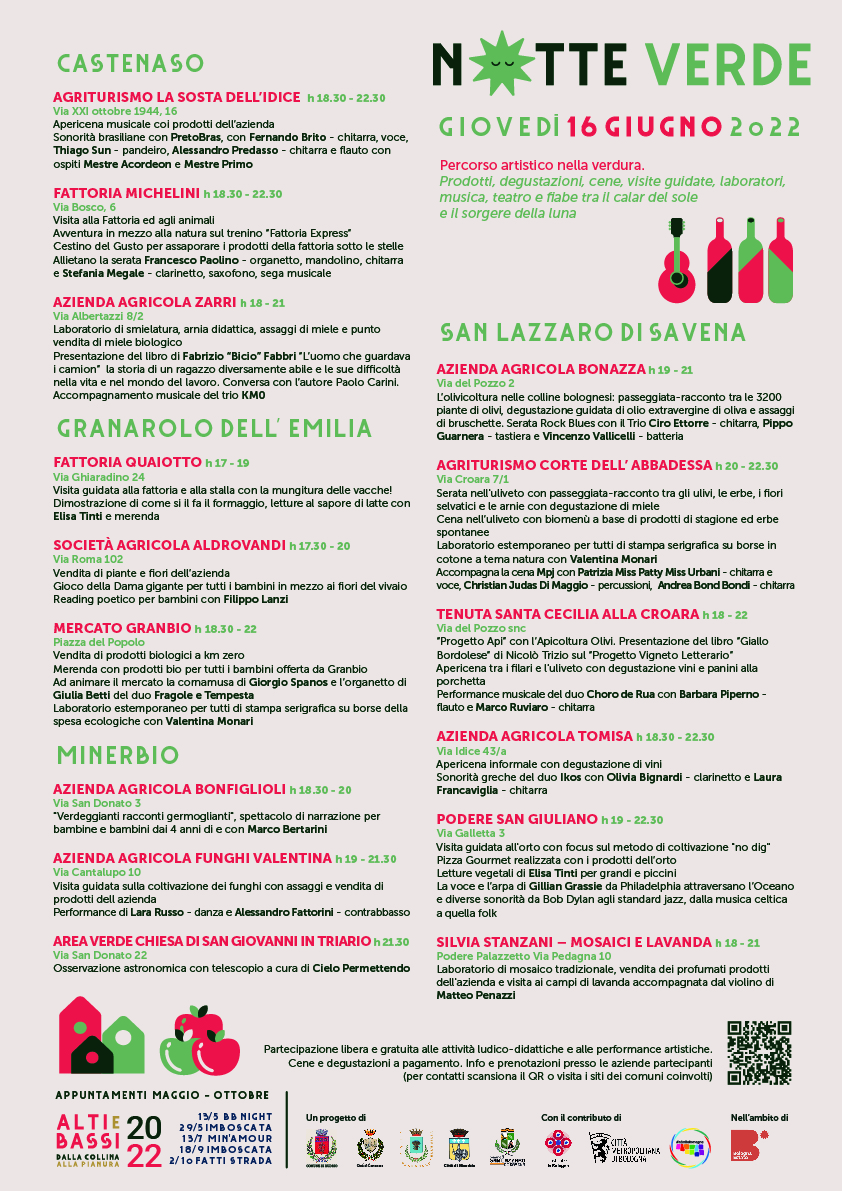 Un susseguirsi artistico diffuso di eventi che si realizza nella stessa serata di giovedì 16 giugno, una delle giornate più lunghe dell’anno, nelle aziende agricole, agriturismi e fattorie didattiche aderenti, nei comuni di Minerbio, Castenaso, Granarolo dell’Emilia, e San Lazzaro di Savena.