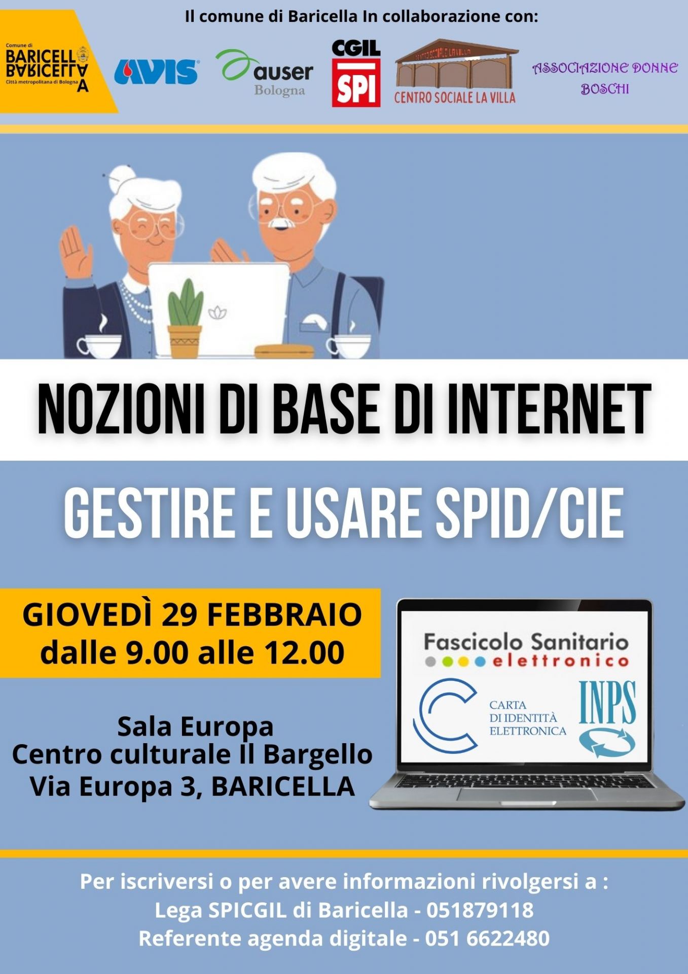 Giovedì 29 Febbraio 2024 dalle 9:00 alle 12:00 il comune di Baricella in collaborazione con SPICGIL, Avis, Auser, le Donne di Boschi e il centro sociale La Villa propone un corso sulle nozioni di base di internet e sull’utilizzo dei servizi digitali che si terrà presso il Centro Culturale Il Bargello.