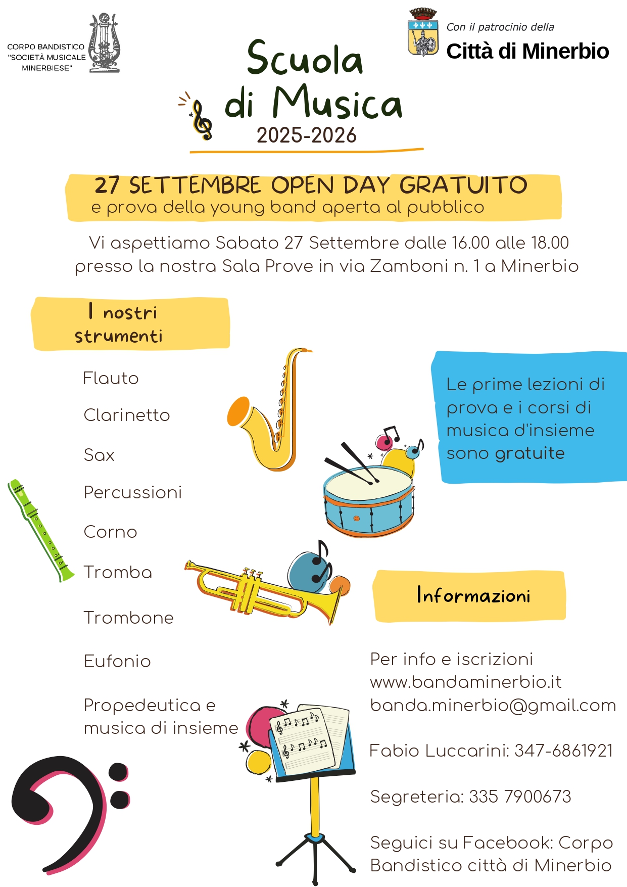 Sabato 27 settembre 2025 dalle 16.00 alle 18.00 nella Sala Prove in via Zamboni n. 1 a Minerbio ci sarà l'Open Day Gratuito della Scuola di Musica del Corpo Bandistico "Città di Minerbio".