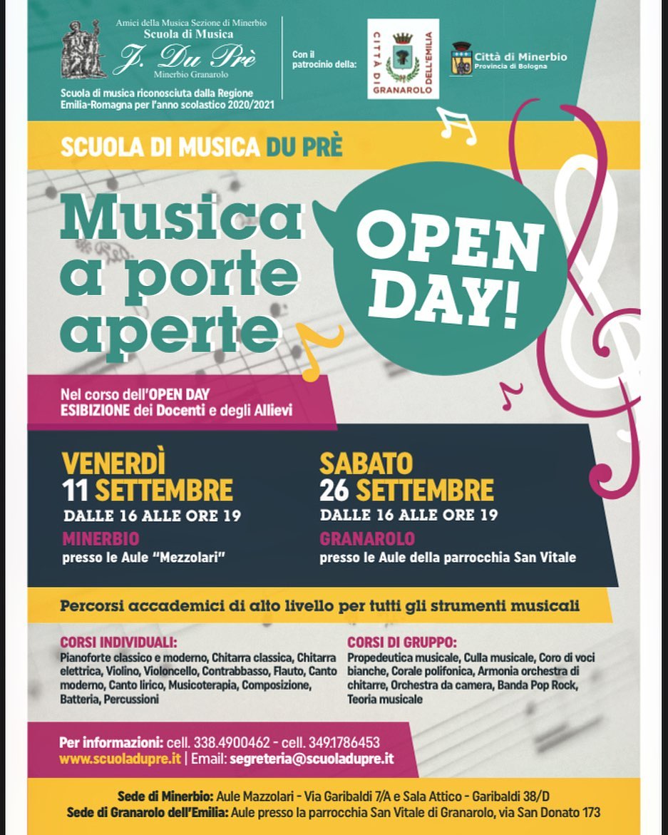 La scuola di musica J. Du Pré invita le famiglie a partecipare all'Open Day sabato 26 settembre, dalle 16 alle 19, presso i locali della Parrocchia della Chiesa San Vitale di Granarolo dell'Emilia.