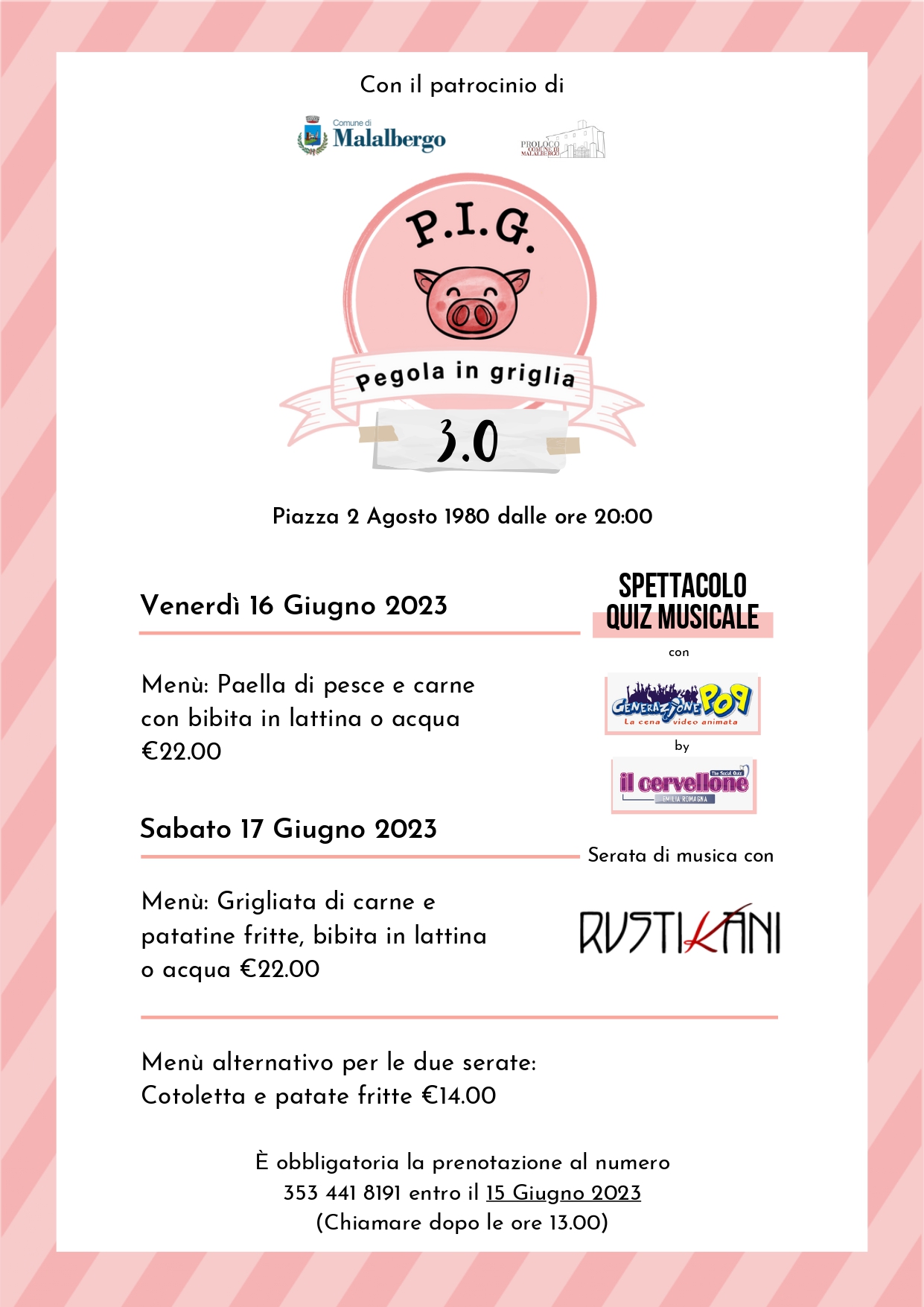 “P.I.G. PEGOLA IN GRIGLIA”, si svolgerà venerdì 16 Giugno e sabato 17 Giugno in Piazza 2 Agosto 1980 a Pegola
