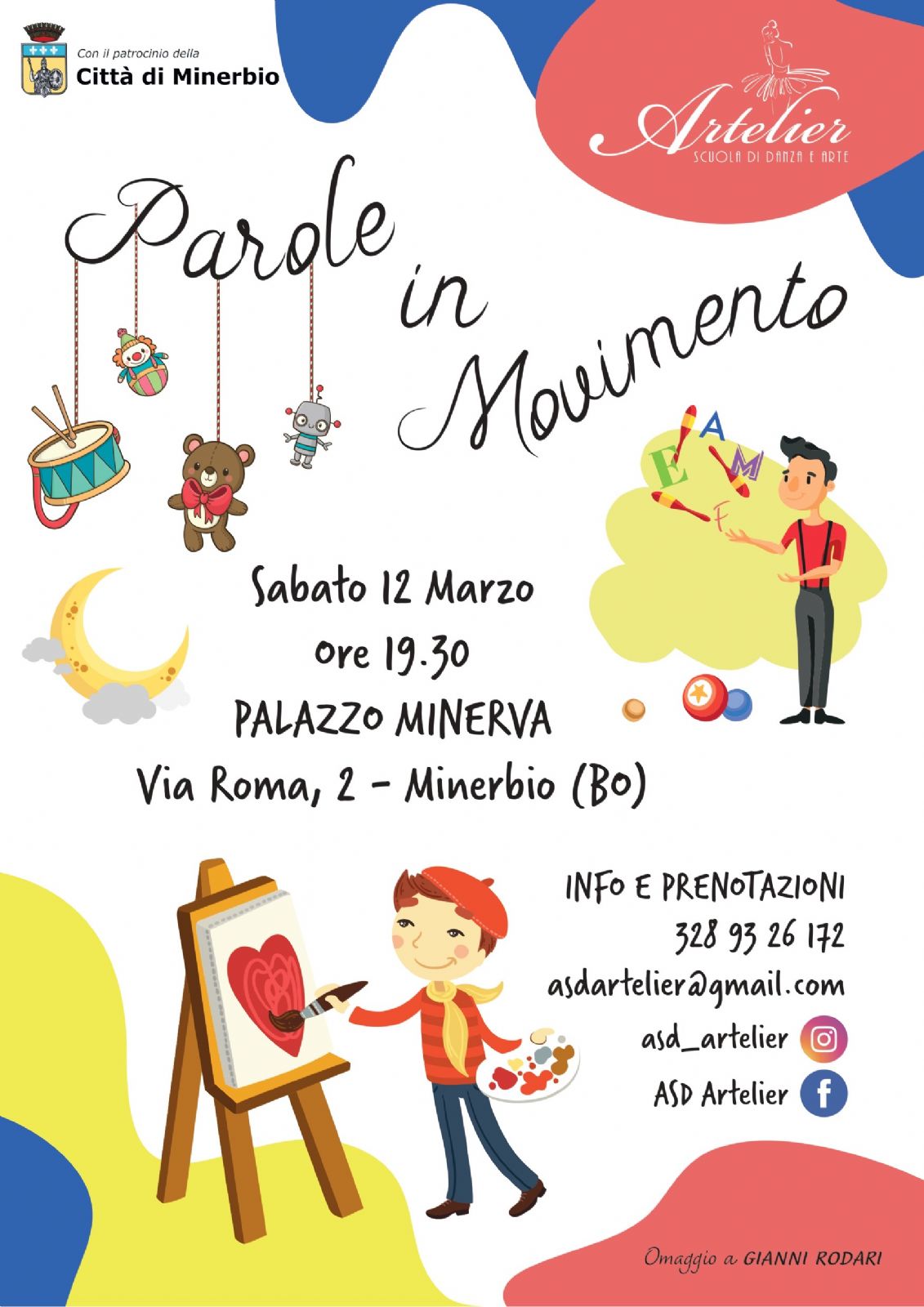 Sabato 12 marzo alle ore 19.30 presso Palazzo Minerva "Parole in movimento" - omaggio a Gianni Rodari, a cura di Artelier, Scuola di danza e arte.