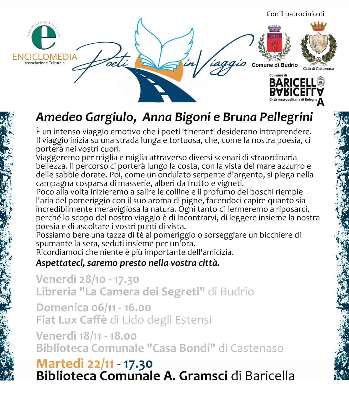I poeti in viaggio arrivano anche a Baricella: martedì 22 novembre alle ore 17:30 presso la Biblioteca di Baricella.
