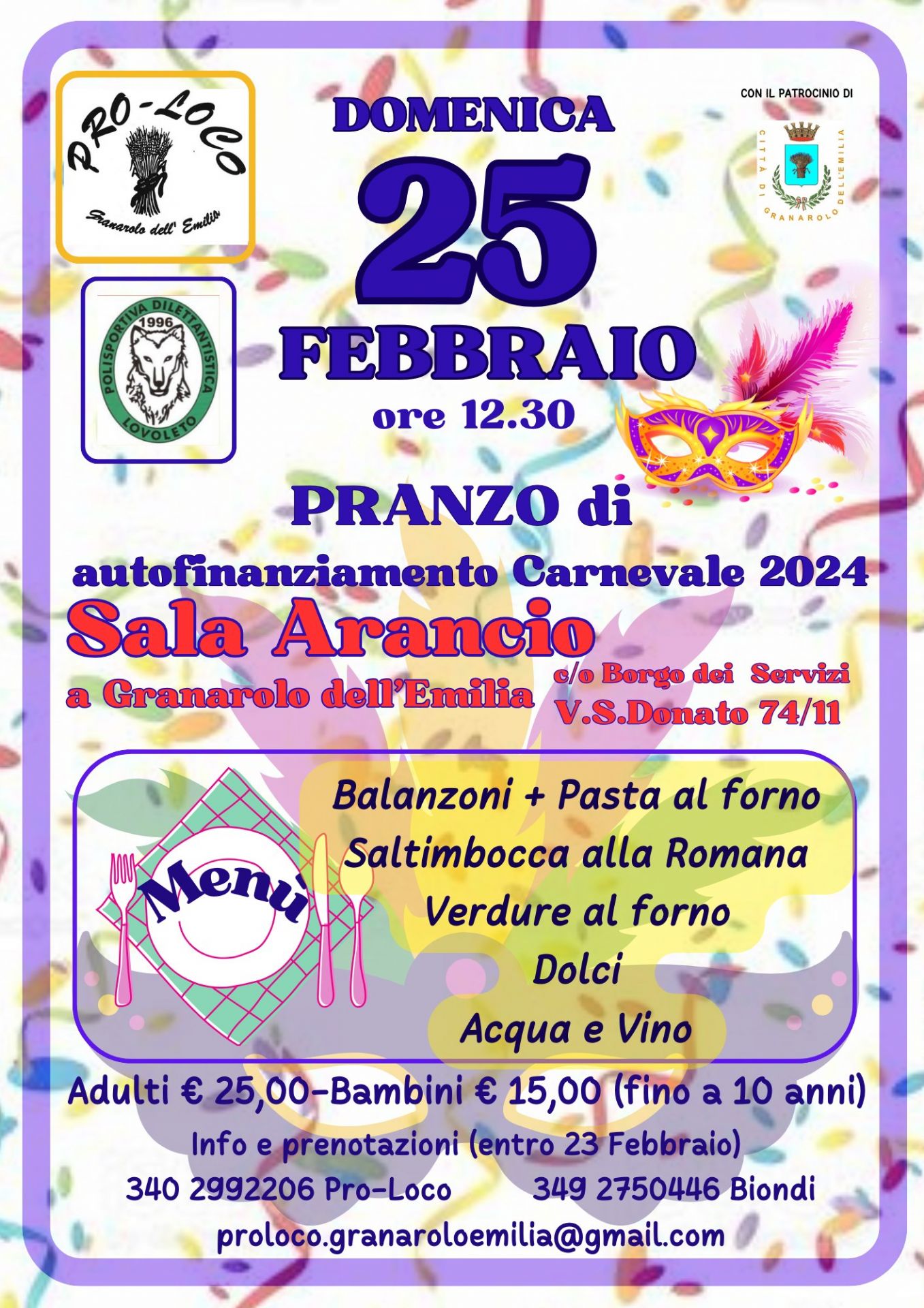 La Pro-Loco Granarolo Dell'Emilia insieme alla Polisportiva Lilettantistica di Lovoleto organizza un pranzo di autofinanziamento che si tiene domenica 25 febbraio alle ore 12,30 presso la Sala Arancio (Borgo Servizi, via San Donato 74/11). L'incasso della giornata sarà utilizzato per rendere ancora più bello il Carnevale dei Bambini a Granarolo che si terrà domenica 3 marzo.
