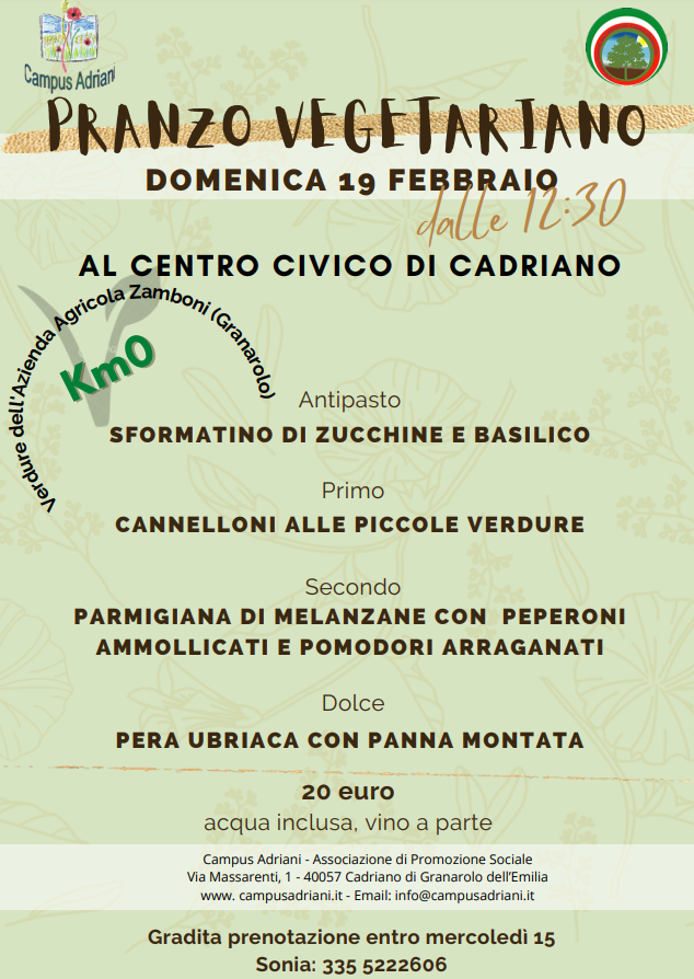Domenica 19 febbraio, dalle ore 12.30 presso il centro civico di Cadriano in via Massarenti 1, l'associazione Campus Adriani organizza un pranzo vegetariano con verdure a km 0, proveniente dall'azienda agricola Zamboni di Granarolo. Il costo del pranzo (il menù nel pdf allegato) è di 20 euro, dall'antipasto al dolce (vino a parte). È gradita la prenotazione entro mercoledì 15 febbraio (Sonia: 335-5222606).