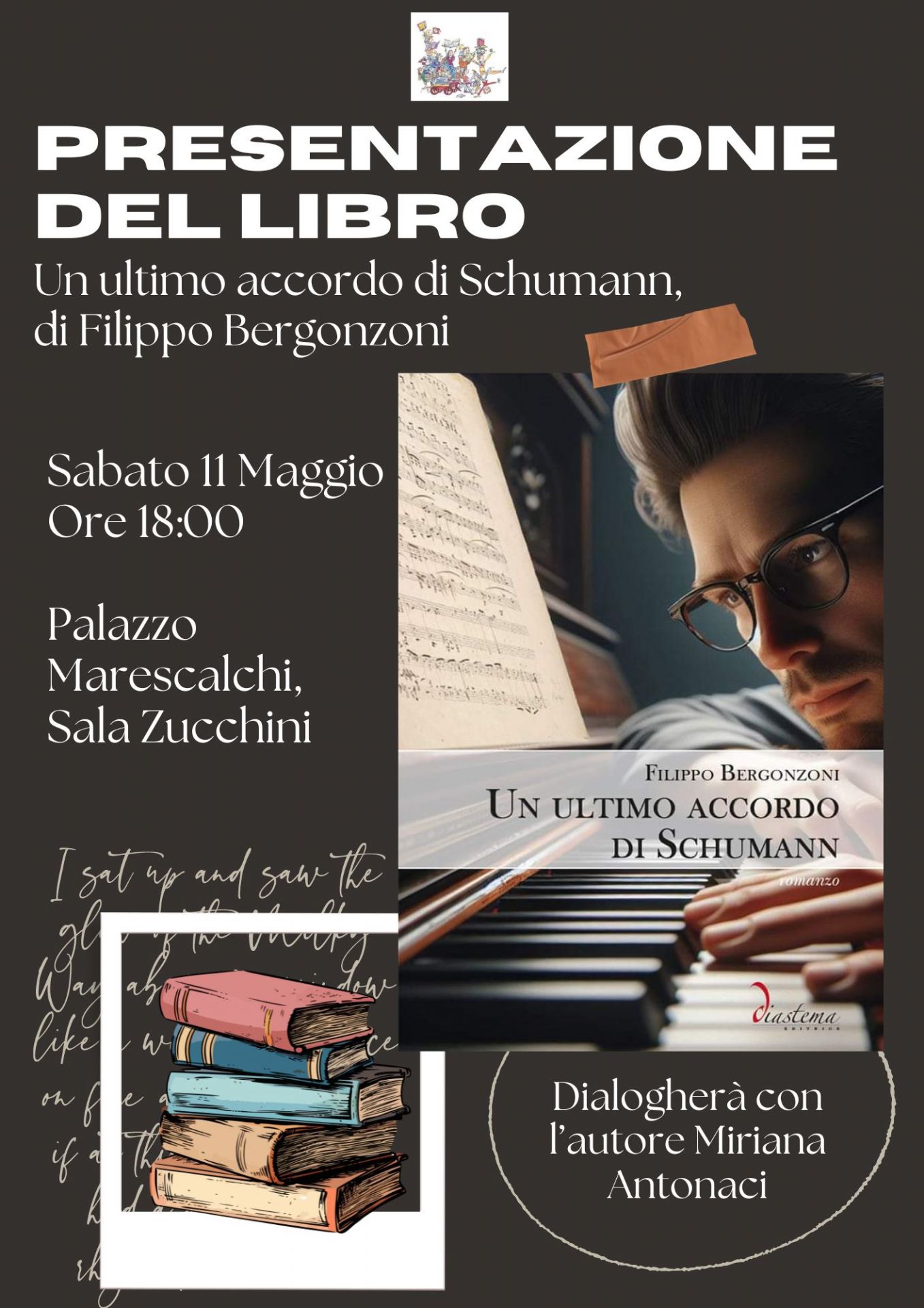 Sabato 11 Maggio alle ore 18:00 in Sala Zucchini si svolgerà la presentazione del libro: Un ultimo accordo di Schumann, di Filippo Bergonzoni.