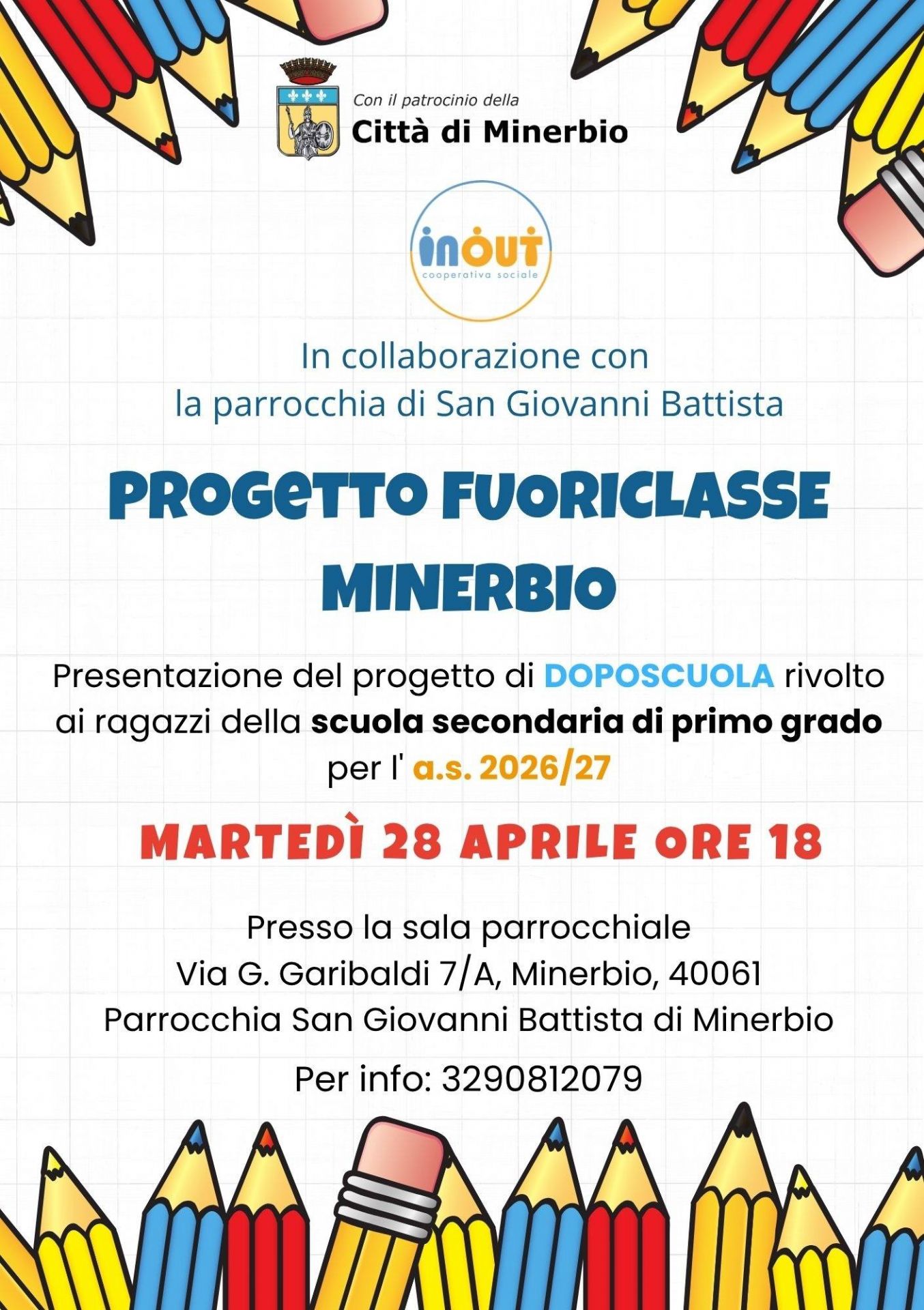 Martedì 28 aprile 2026 alle ore 18.00 presso la Sala parrocchiale in via G. Garibaldi 7/a a Minerbio la Cooperativa Sociale INOUT, in collaborazione con la Parrocchia San Giovanni Battista di Minerbio, organizza la presentazione del progetto di doposcuola "Fuoriclasse Minerbio" rivolto ai ragazzi della Scuola secondaria di 1° grado a.s. 2026/2027.