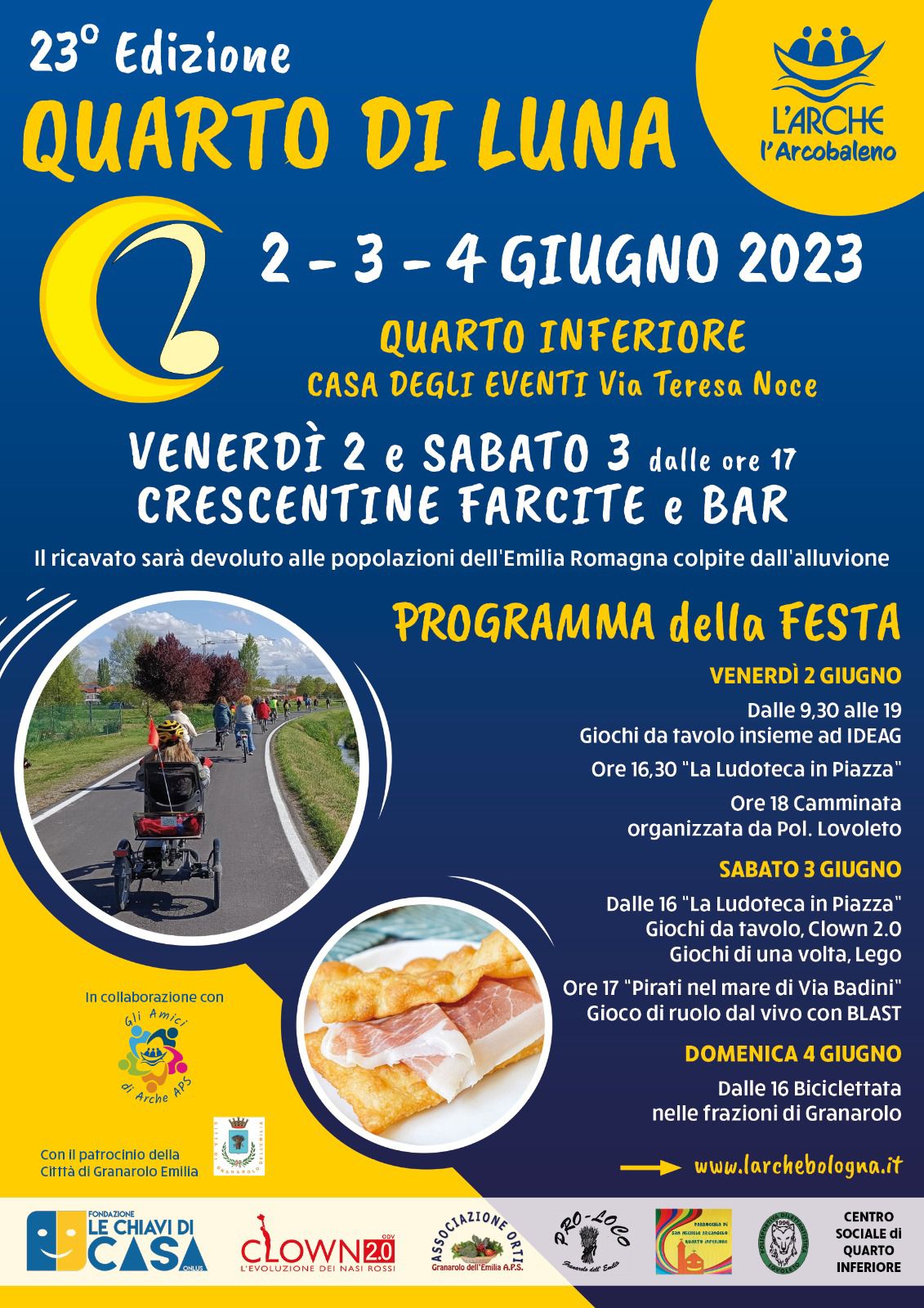 Da venerdì 2 a domenica 4 giugno l'appuntamento è a Quarto Inferiore, presso la Casa degli Eventi di Via Teresa Noce. La festa è organizzata da L'Arche Comunità L'Arcobaleno in collaborazione con Gli Amici di Arche Aps, Fondazione Le Chiavi di Casa, Clown 2.0, Associazione Orti, Pro-Loco Granarolo Dell'Emilia, Parrocchia di Quarto Inferiore, Polisportiva dilettantistica lovoleto, Centro Sociale Quarto Inferiore, IDEAG. Il ricavato della festa sarà devoluto alle popolazioni dell'Emilia-Romagna colpite dall'alluvione. LLa manifestazione ha il patrocinio del Comune di Granarolo dell'Emilia