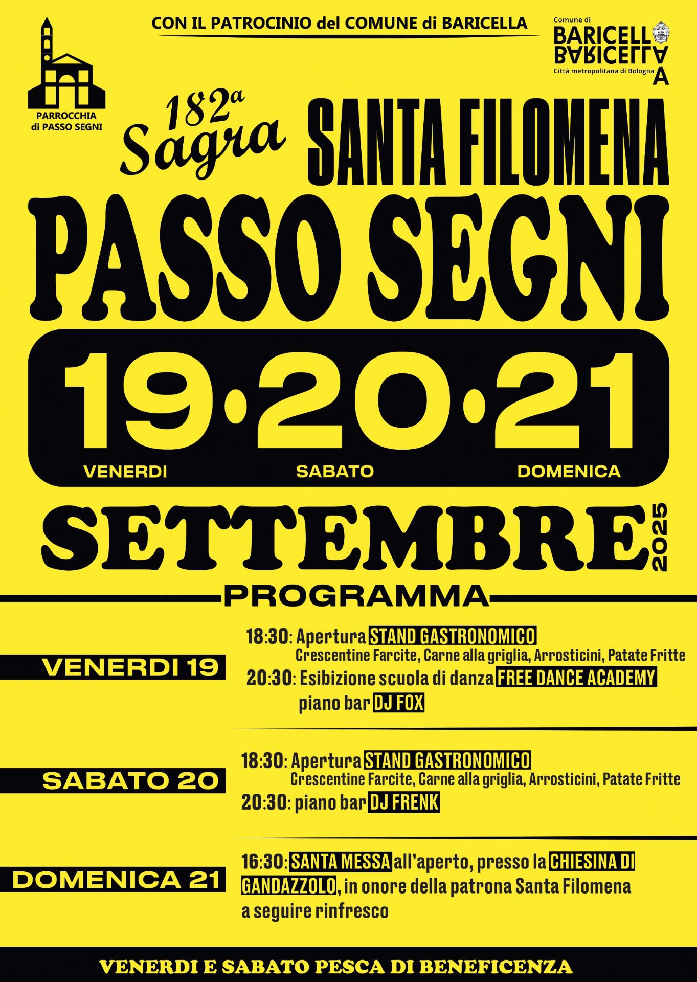 Dopo 12 anni, con grande entusiasmo, torna la Sagra di Santa Filomena nella sua veste tradizionale, con stand gastronomico, musica, pesca di beneficenza e momenti di incontro come una volta, mantenendo uno spirito austero ma festoso per celebrare insieme la nostra patrona.