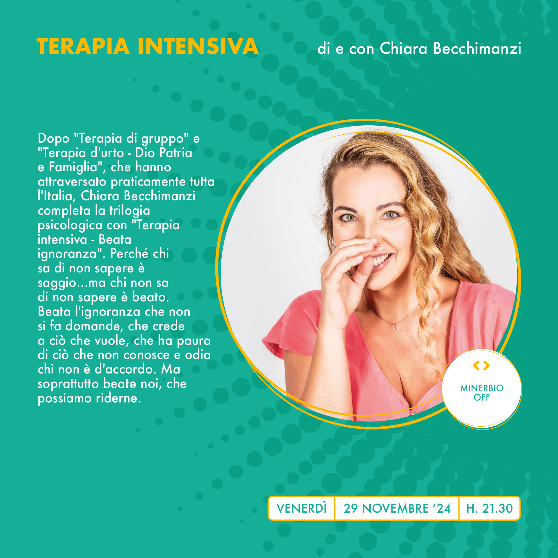 Dopo "Terapia di gruppo" e "Terapia d'urto - Dio Patria e Famiglia", che hanno attraversato praticamente tutta l'Italia, Chiara Becchimanzi completa la trilogia psicologica con "Terapia intensiva - Beata ignoranza". Perché chi sa di non sapere è saggio...ma chi non sa di non sapere è beato. Beata l'ignoranza che non si fa domande, che crede a ciò che vuole, che ha paura di ciò che non conosce e odia chi non è d'accordo. Ma soprattutto beatə noi, che possiamo riderne.