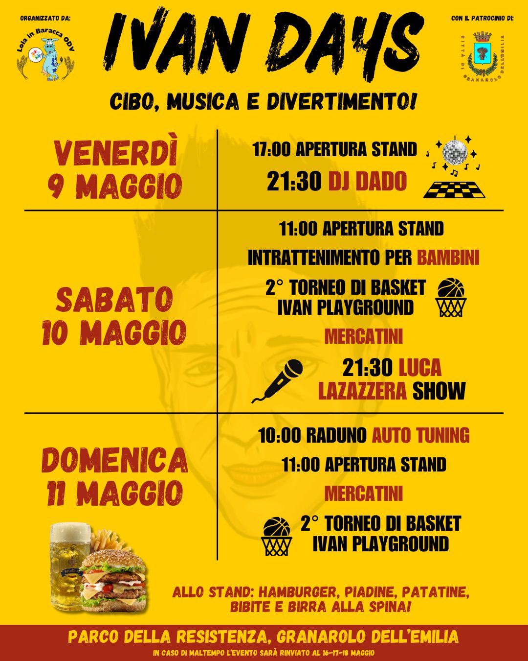 Il programma prevede un ricco calendario di eventi per tutte le età. Si parte venerdì 9 maggio con l’apertura degli stand gastronomici alle ore 17.00, seguita alle 21.30 dal dj set di Dado DJ. Sabato 10 maggio la festa prosegue fin dal mattino: a partire dalle 11.00 sarà possibile pranzare e cenare presso gli stand, mentre per tutta la giornata saranno attivi i mercatini, l’intrattenimento per bambini e il 2° Torneo di basket Ivan Playground. Alle 21.30, spettacolo serale con il Luca Lazazzera Show.