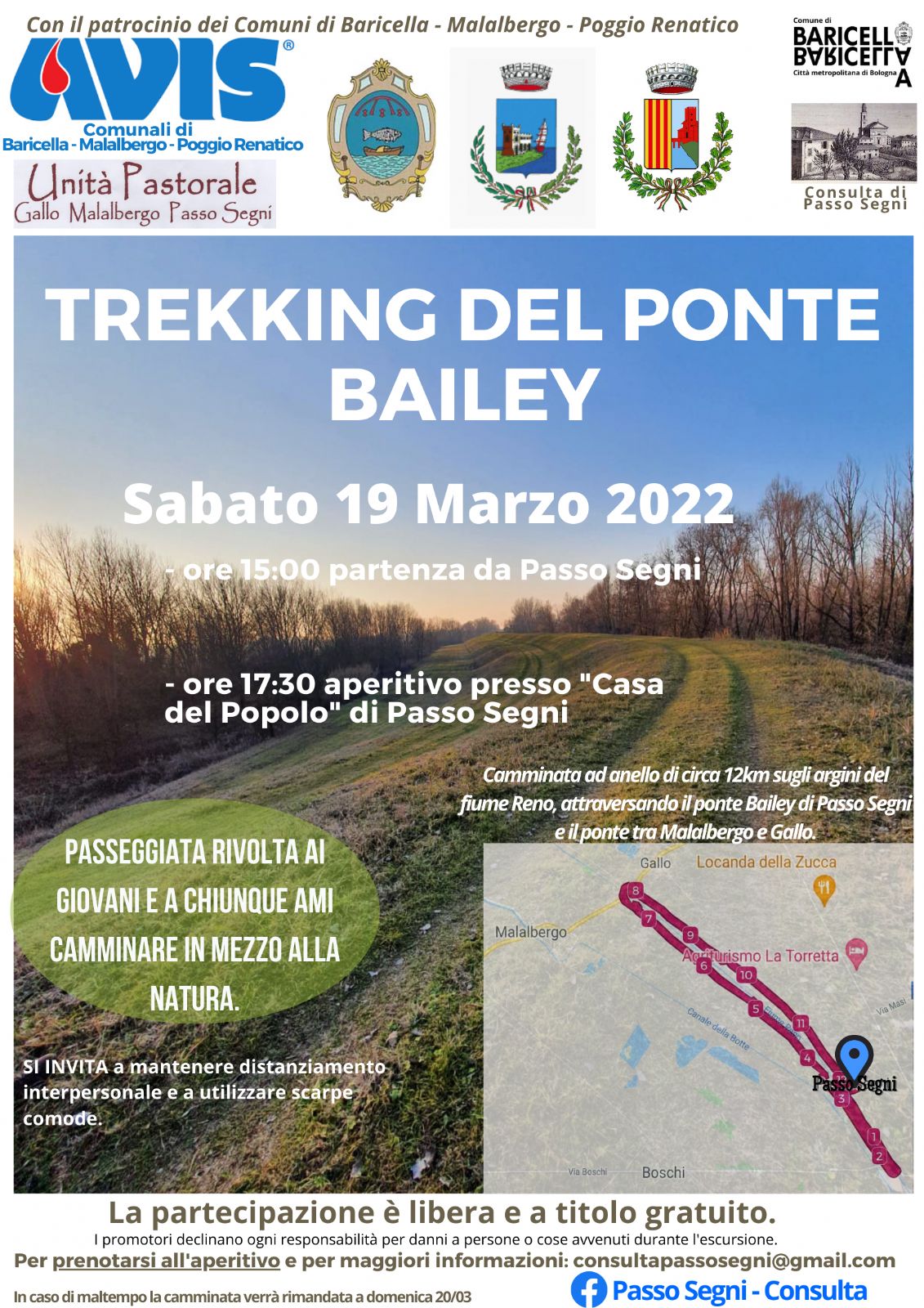 Per tutti gli amanti del trekking, Sabato 19 Marzo 2022, la Consulta di Passo Segni, con il patrocinio del Comune di Baricella, Malalbergo e Poggio Renatico, ha organizzato una camminata ad anello di circa 12 chilometri in mezzo alla natura, che attraversa due province e tre comuni diversi.