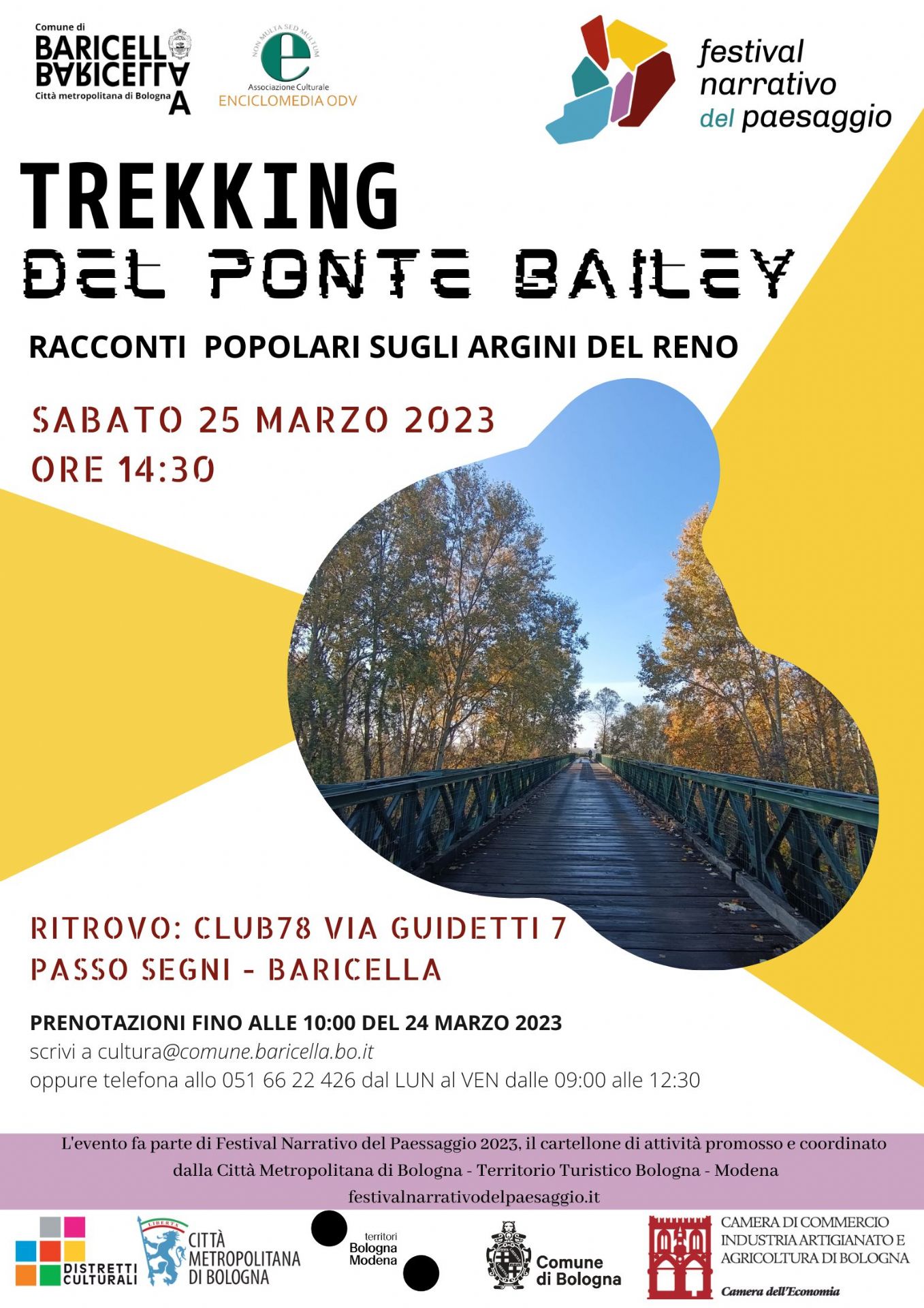 Nell'ambito della prima edizione del Festival Narrativo del Paesaggio 2023, il cartellone di attività promosso e coordinato dalla Città metropolitana di Bologna - Territorio Turistico Bologna - Modena, Sabato 25 Marzo a Baricella si svolgerà l'iniziativa Trekking del Ponte Bailey: racconti popolari sugli argini del Reno.