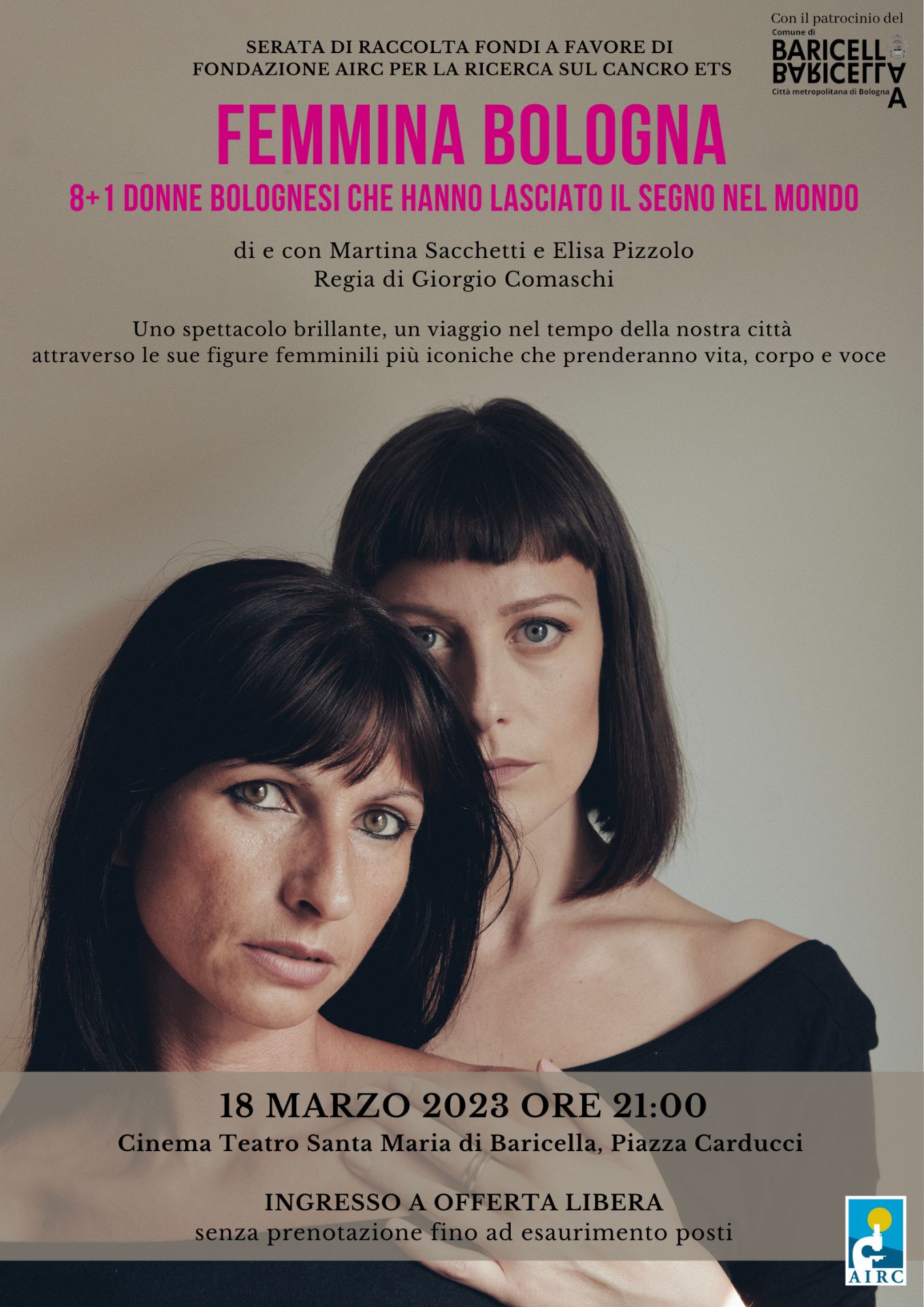 L'ultimo appuntamento della rassegna di eventi dedicati alla Giornata Internazionale della donna, sarà il 18 Marzo alle ore 21:00 presso il Cinema Teatro Santa Maria di Baricella con lo spettacolo teatrale, patrocinato dal Comune di Baricella, “FEMMINA BOLOGNA: 8+1 donne bolognesi che hanno lasciato il segno nel mondo”, di e con Martina Sacchetti ed Elisa Pizzolo, regia di Giorgio Comaschi.