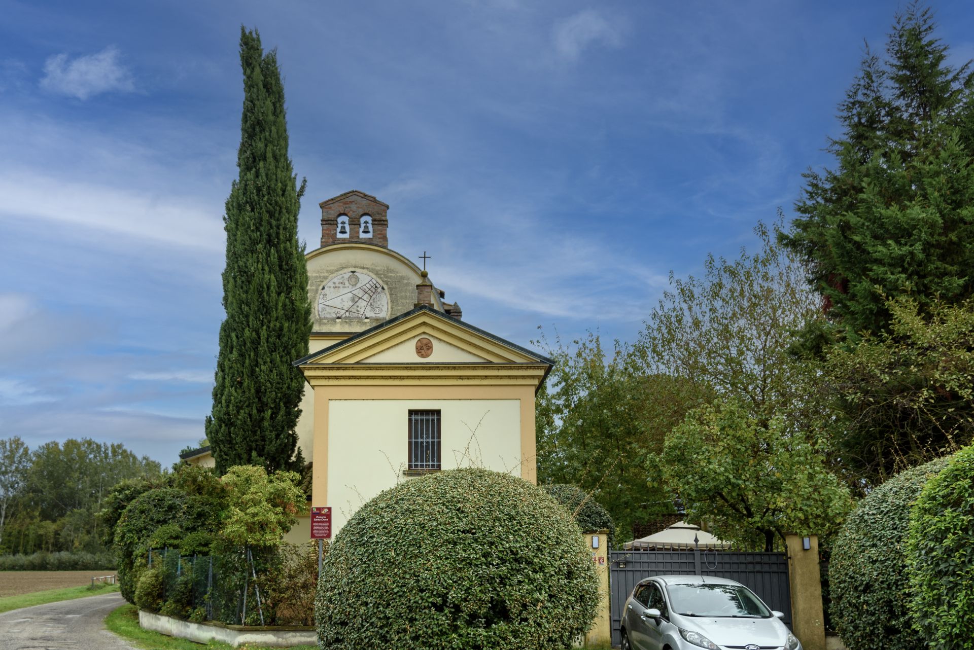 Questo elemento è decorato da una meridiana dipinta ed è, a sua volta, sormontato da un campaniletto a vela.