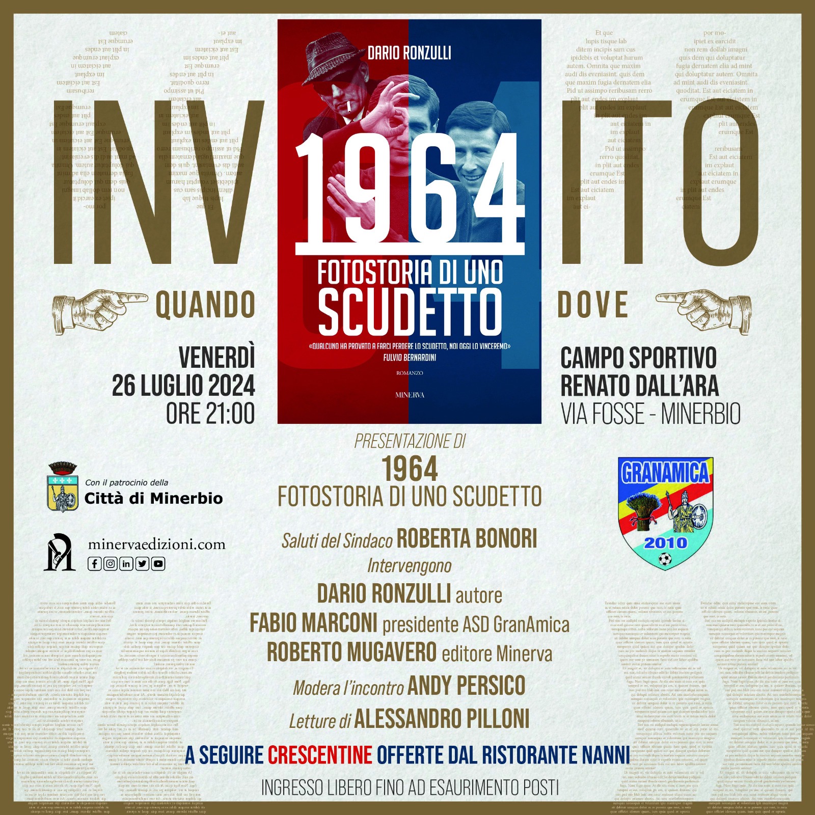 Venerdì 26 luglio 2024 alle ore 21.00 al Campo sportivo R. Dall'Ara di Minerbio, in via Fosse, si terrà la presentazione del libro di Dario Ronzulli: 1964: Fotostoria di uno scudetto, Edizioni Minerva.