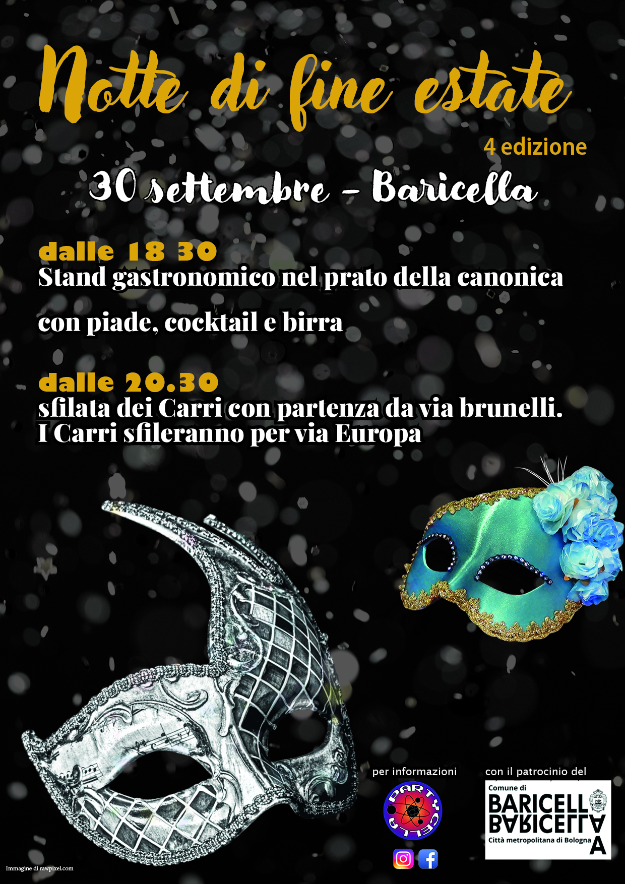 Sabato 30 Settembre 2023 torna lungo le strade di Baricella il Carnevale Notturno organizzato dall’Associazione Partycella! Giunto ormai alla sua 4° Edizione, non perdetevi una notte di fine estate ricca di cibo e tanto divertimento!