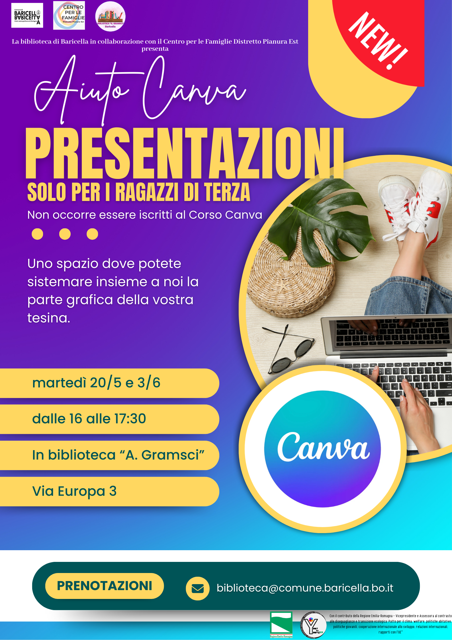 La partecipazione è gratuita ma per iscriverti è necessario inviare una mail a biblioteca@comune.baricella.bo.it allegando il modulo in calce debitamente compilato e firmato (da non inviare se si era iscritti al corso base canva), prenotando uno slot di 30'.