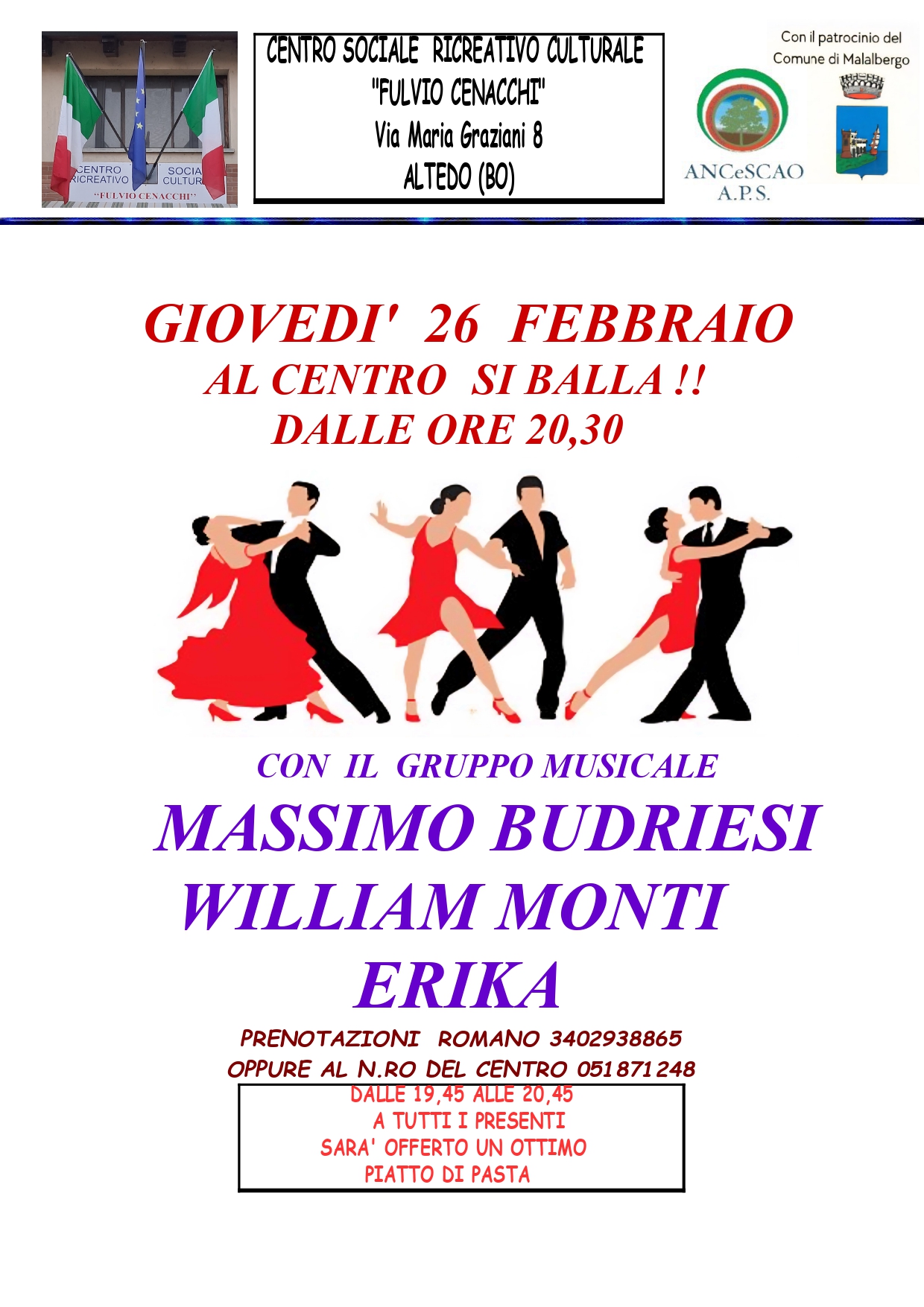 Per prenotazioni 051/871248 oppure Romano 340/2938865.
