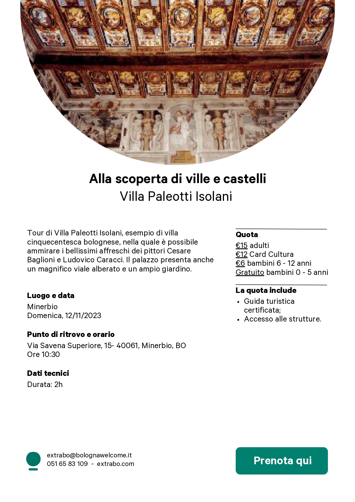 Tour di Villa Paleotti Isolani, esempio di villa cinquecentesca bolognese, nella quale è possibile ammirare i bellissimi affreschi dei pittori Cesare Baglioni e Ludovico Caracci. Il palazzo presenta anche un magnifico viale alberato e un ampio giardino.