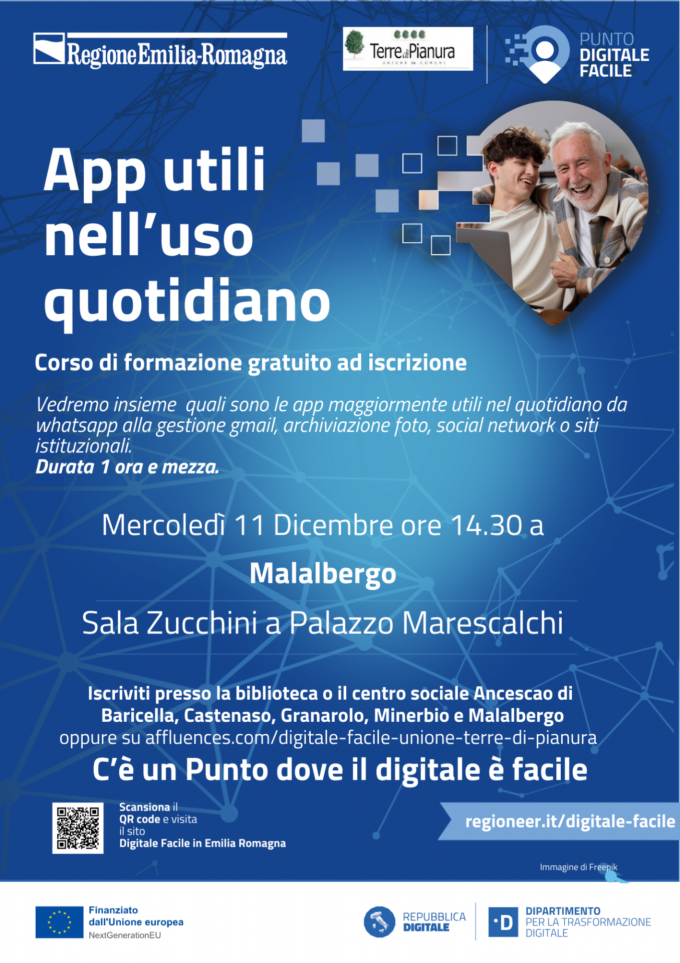 Mercoledì 11 Dicembre alle ore 14.30 presso la Sala Zucchini a Palazzo Marescalchi si svolgerà il Corso di formazione gratuito del Punto Digitale Facile su APP UTILI NELL'USO QUOTIDIANO.