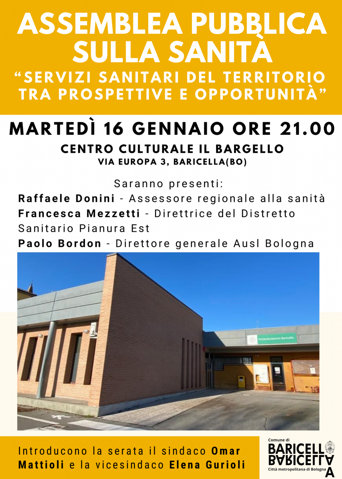Si terrà Martedì 16 Gennaio alle 21.00 presso il Centro Culturale "Il Bargello" (via Europa 3, Baricella) l'incontro pubblico sui servizi sanitari voluto dall'amministrazione comunale per offrire alla cittadinanza un momento di confronto aperto a tutti/e sulle prospettive e le opportunità, nel nostro territorio, di un bene comune e primario come la sanità pubblica.