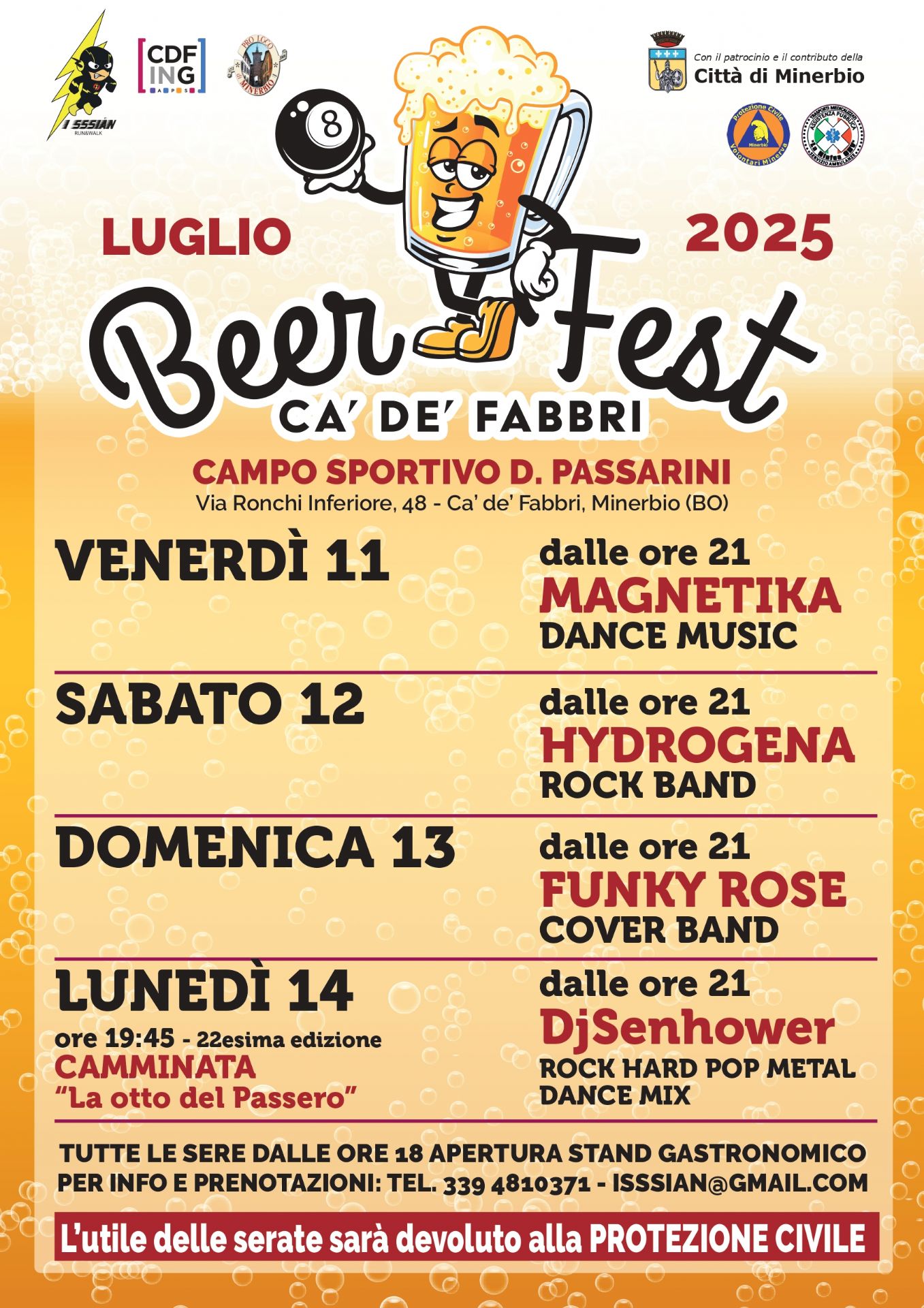 Dal venerdì 11 al lunedì 14 luglio 2025, il Beer Fest di Ca' De' Fabbri ti aspetta presso il campo sportivo D. Passerini, via Ronchi Inferiore, 48 per quattro serate di musica, birra e divertimento.