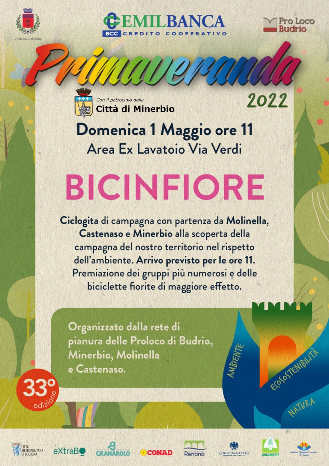 Domenica 1 maggio al via la prima edizione di partecipazione per Minerbio a "Bicinfiore": la ciclogita di campagna che attraverserà i territori di Molinella, Castenaso e Minerbio alla scoperta della campagna del nostro territorio nel rispetto dell'ambiente.