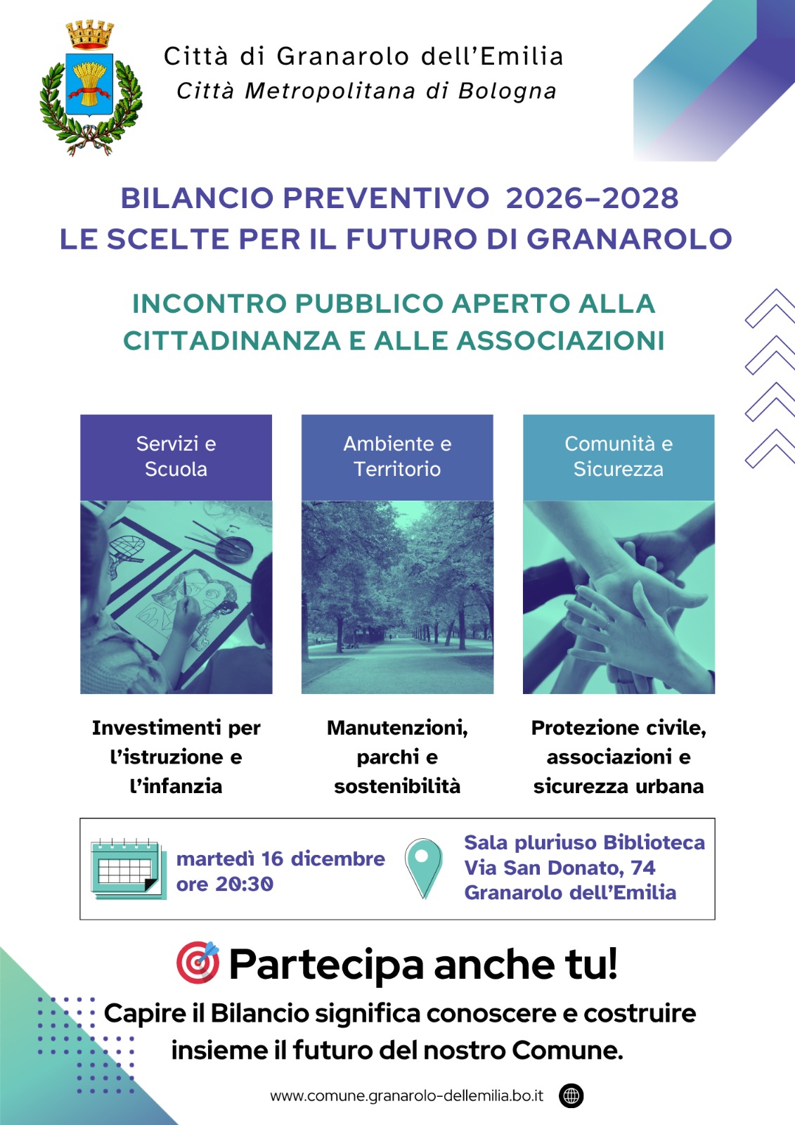 Il Comune di Granarolo dell’Emilia invita la cittadinanza e le associazioni del territorio all’incontro pubblico dedicato alla presentazione del Bilancio preventivo 2026–2028, un’occasione importante per conoscere da vicino le scelte strategiche che guideranno lo sviluppo della comunità nei prossimi anni.