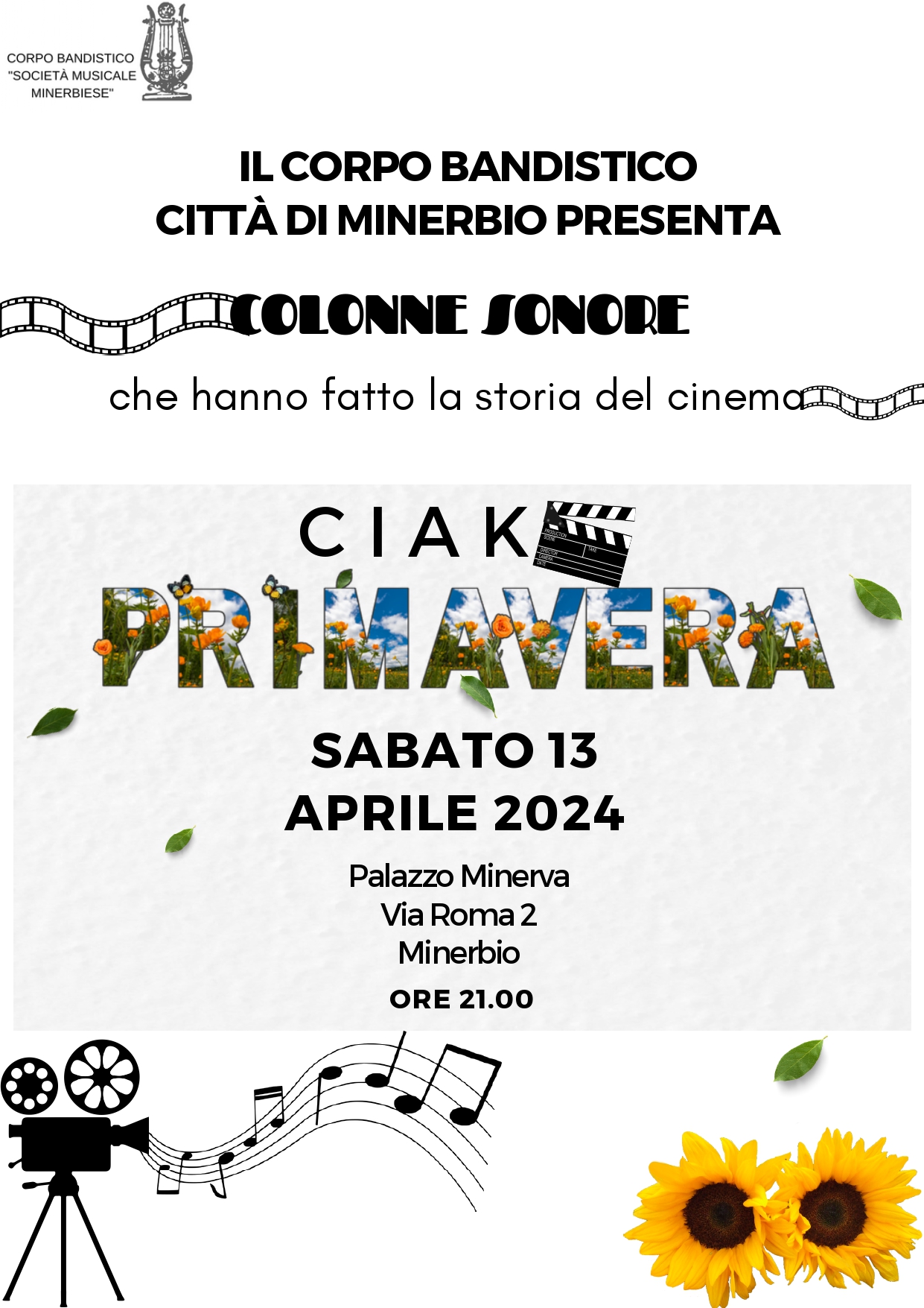 Sabato 13 aprile 2024 alle ore 21.00 presso il teatro Palazzo Minerva si terrà il Concerto di primavera del Corpo Bandistico Città di Minerbio dal titolo "Ciak Primavera: colonne sonore che hanno fatto la storia del cinema".