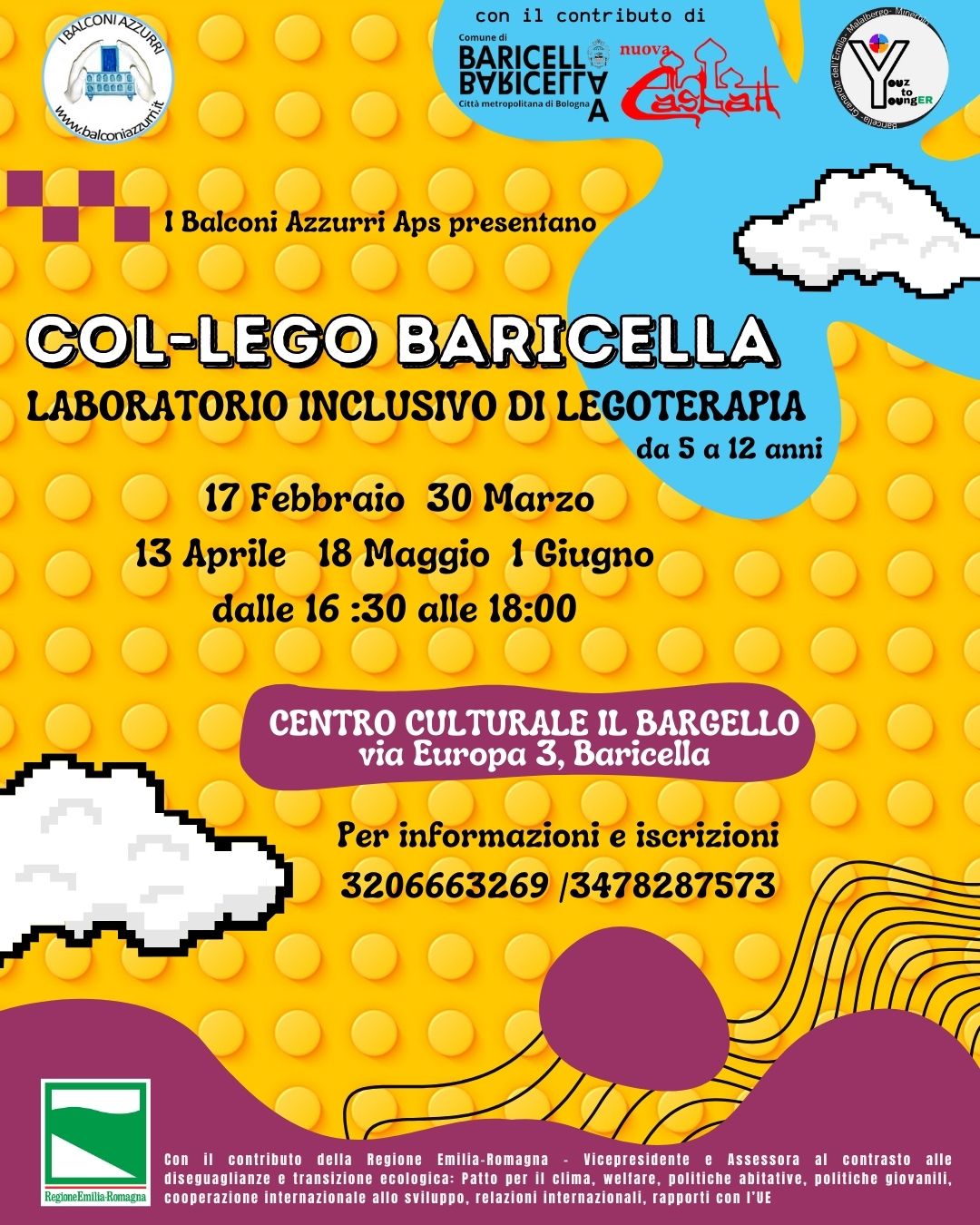 L’associazione Balconi Azzurri, con il contributo del comune di Baricella e dell'Associazione Nuova Casbah, dà il via a un laboratorio inclusivo di legoterapia per i bambini e le bambine dai 5 ai 12 anni. Un'occasione di svago e divertimento per i più piccoli con un'attività ludica che favorisce la comunicazione, la condivisione e la socialità tra i bambini.