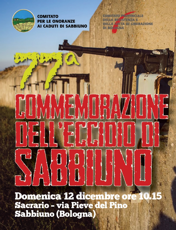 Domenica 12 dicembre si tiene la 77ͣ commemorazione dell'eccidio di Sabbiuno, presso il Sacrario in via Pieve del Pino (Bologna). La cerimonia inizierà alle ore 10.15 e prevede la benedizione del monumento e la deposizione delle corone.