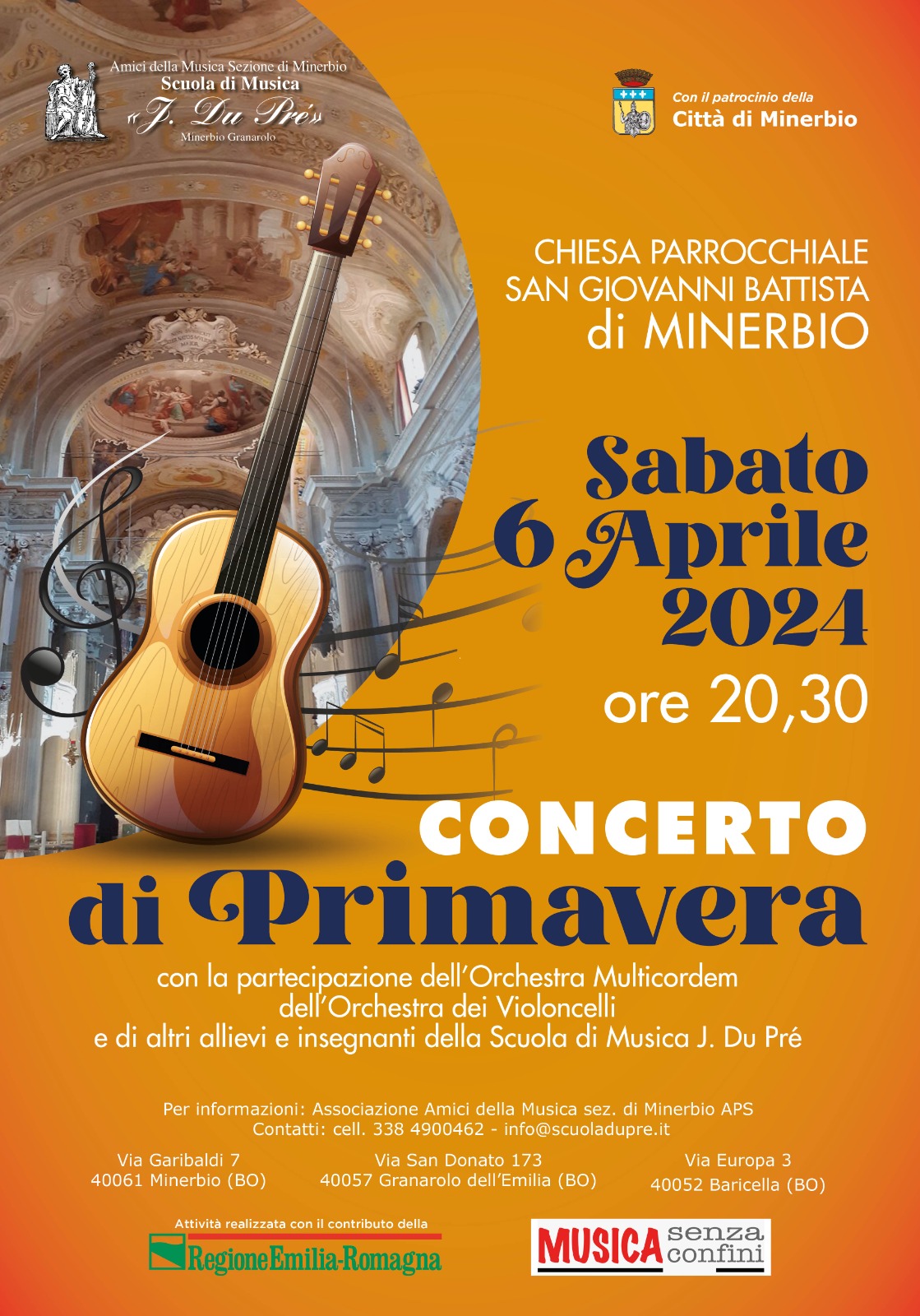 Sabato 6 aprile 2024 alle ore 20.30 presso la Chiesa Parrocchiale San Giovanni Battista di Minerbio l'associazione Amici della Musica sez. di Minerbio Aps, con il patrocinio del Comune di Minerbio, organizza il Concerto di Primavera.