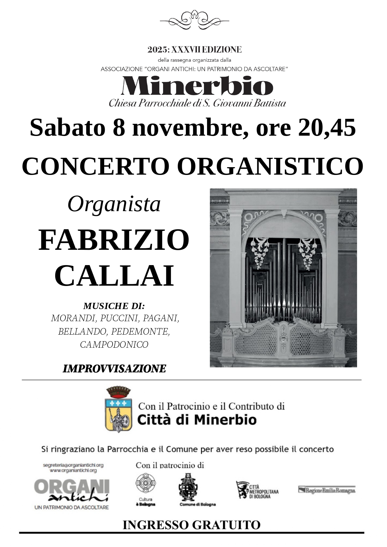 Sabato 08 Novembre 2025, alle ore 20:45 presso la Chiesa Parrocchiale di S. Giovanni Battista di Minerbio si terrà il concerto dell'organista Fabrizio Callai.