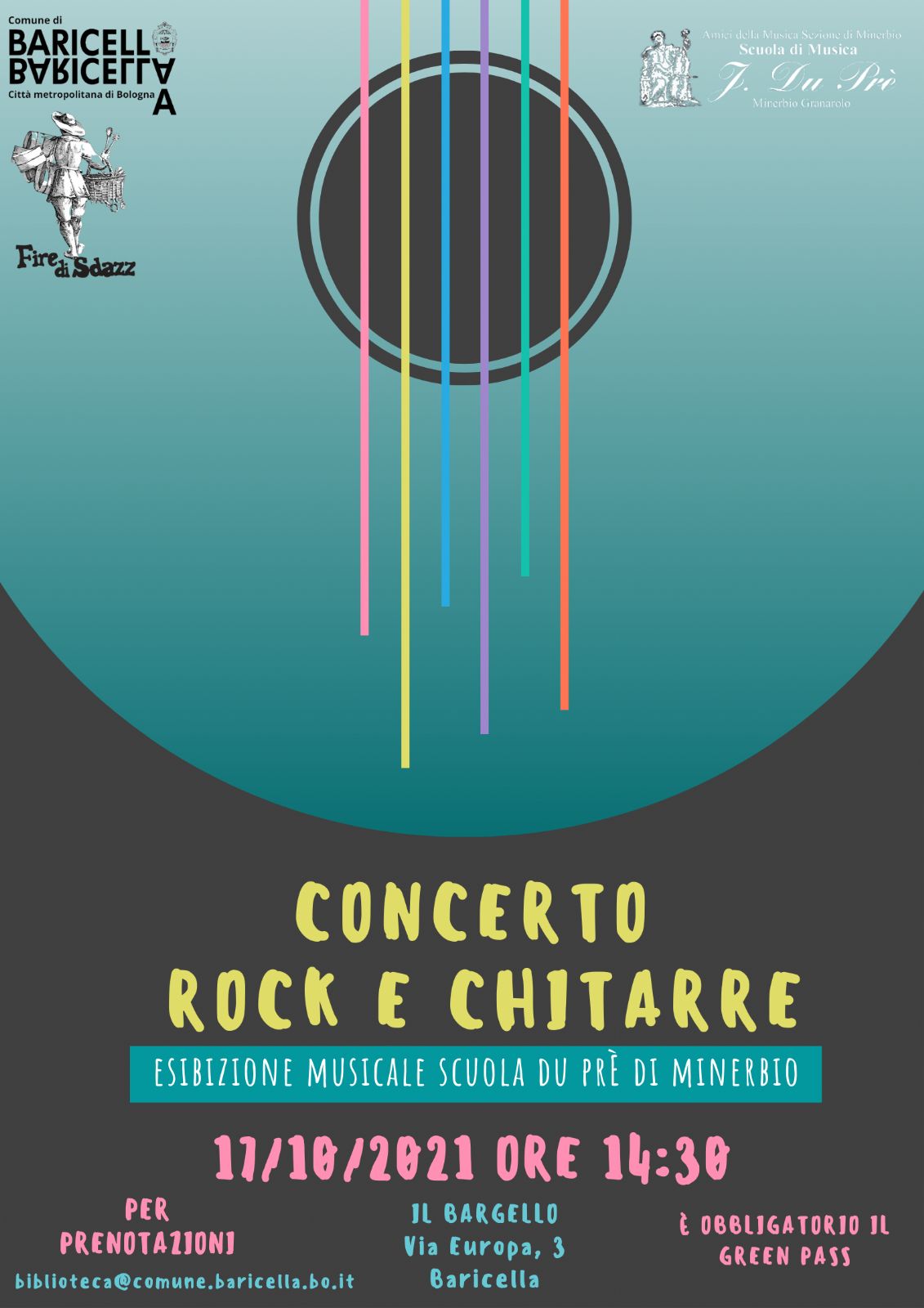 domenica 17 Ottobre 2021 dalle 14:30 presso la Sala Europa del Centro Culturale il Bargello (via Europa 3, Baricella), si terrà un'esibizione musicale della Scuola di Musica J.Du Pré, dal titolo CONCERTO ROCK E CHITARRE.