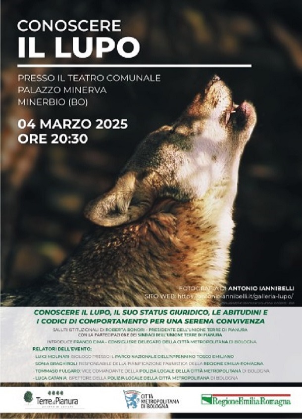 Martedì 4 marzo 2025, alle ore 20:30, si terrà un incontro informativo presso il Teatro Comunale Palazzo Minerva, in via Roma, 2 per conoscere il lupo, il suo status giuridico, le abitudini e i codici di comportamento, per una serena convivenza. Negli ultimi anni, i lupi hanno riconquistato ampie aree pianeggianti, inclusa la pianura bolognese. Questi animali trovano rifugio nelle aree verdi tra i campi coltivati e si nutrono prevalentemente di nutrie e lepri; non rappresentano una minaccia diretta per l'uomo, ma è fondamentale evitare comportamenti che potrebbero farli avvicinare troppo alle abitazioni.
