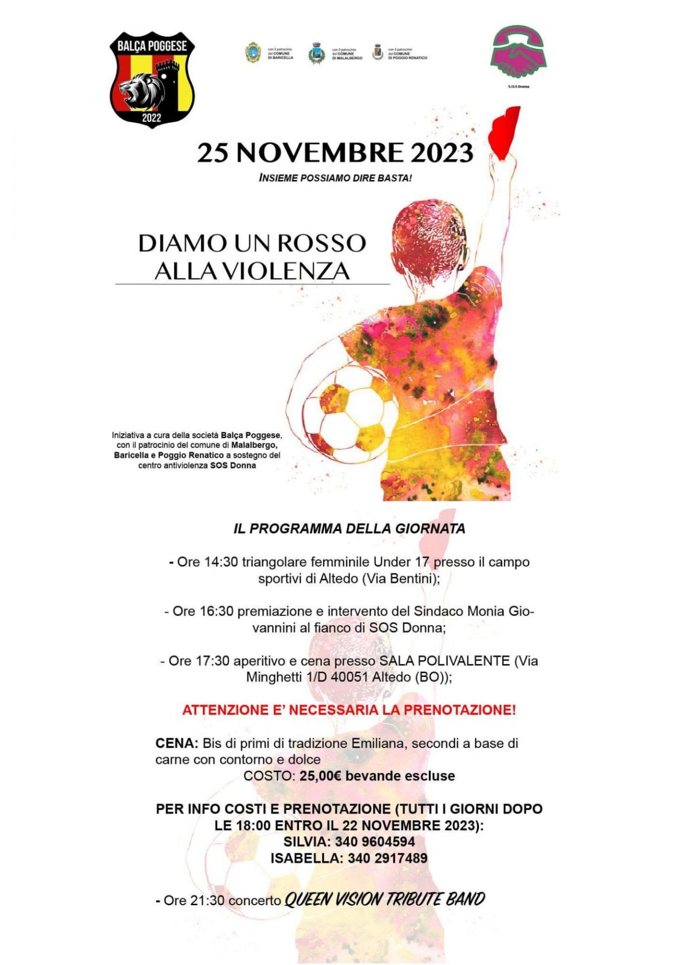 Per la Giornata Internazionale Contro la Violenza sulle Donne sabato 25 Novembre si terrà l'iniziativa Diamo un Rosso alla Violenza a cura della società Balça Poggese e patrocinata dal comune di Malalbergo .