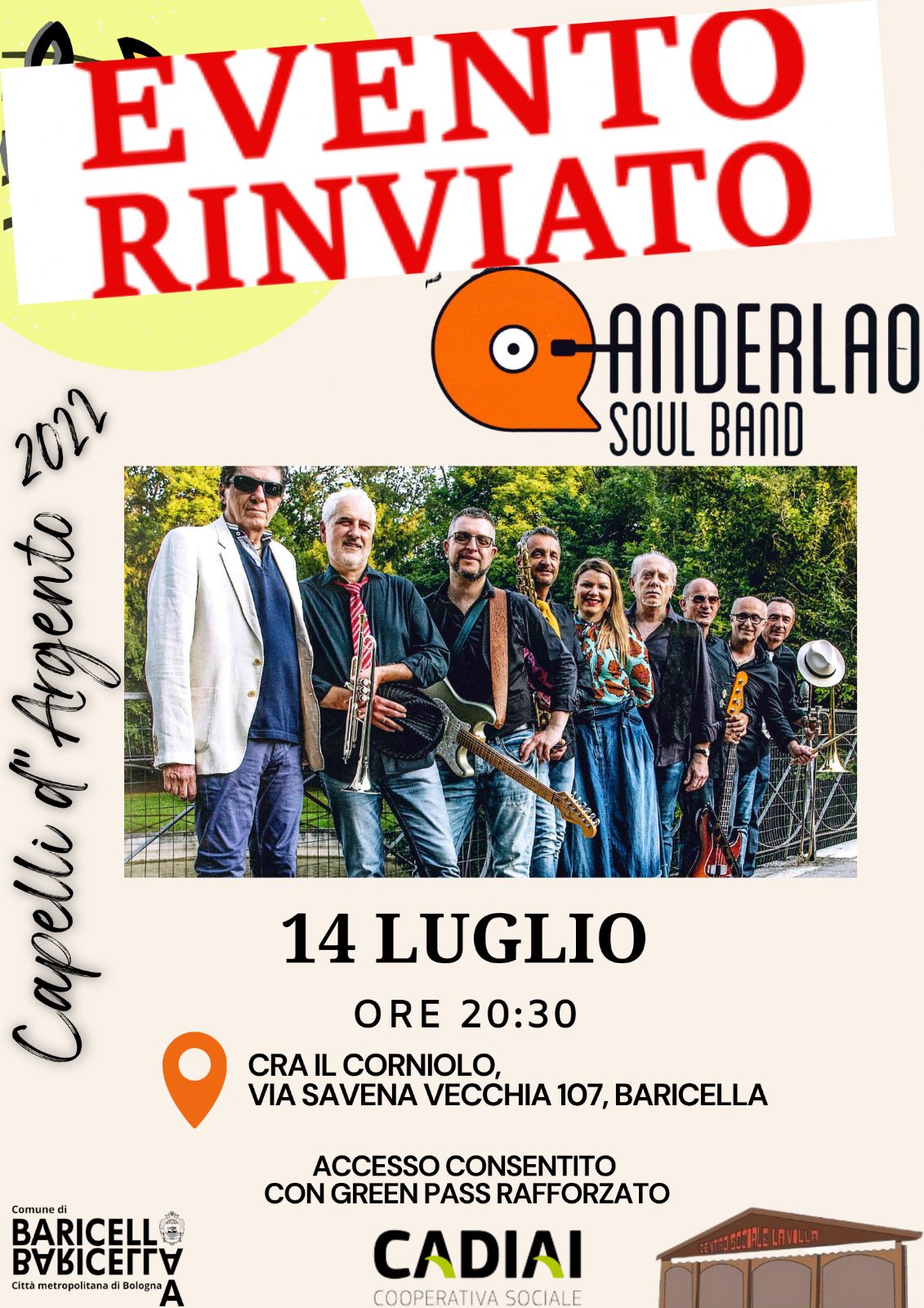 Per motivi precauzionali legati all'aumento del rischio di contagio da Covid, è annullata la data del concerto dell' ANDERLAO BAND prevista per Giovedì 14 Luglio alle ore 20:30 presso la CRA Il Corniolo.
